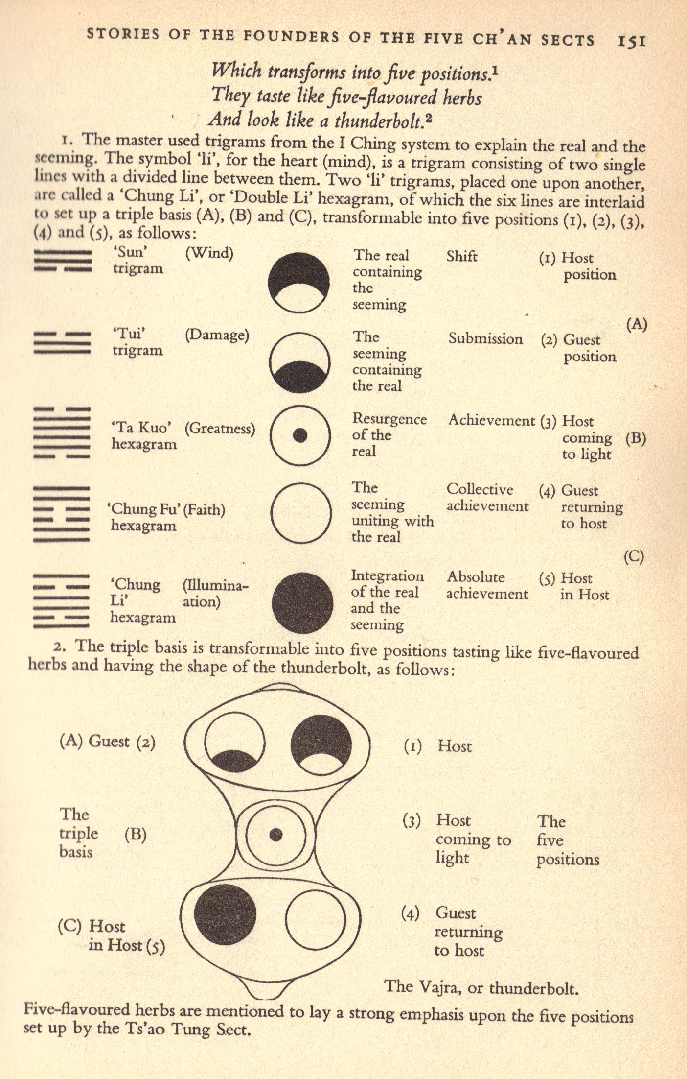 The use of roundel imagery has existed in China for thousands of years. Originally this may have referred to phases of the moon which are depicted using roundels of shaded and unshaded areas. Eventually, this kind of symbolism evolved into the theoretical representation of philosophical notions such as yang and yin, or light and its absence, and in-turn were modified to represent stages of meditational development within both Daoism and Ch’an Buddhism. For instance, the Cao-Dong School of Ch’an use the following roundel arrangement to describe the stages of insight acquisition: