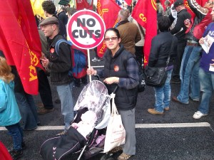 We marched today to maintain internationalism and friendship across the world and to protest at the infiltration of the right wing into every day life. We marched today to put a stop to racism, prejudice, and discrimination. We marched today for all those who could not march and who will be the most damaged by this ruthless attack upon the British Welfare State perpetuated by Prime Minister David Cameron and his coalition of the Conservative Party and the Liberal Democratic Party. Due to the unpopularity of this government – who hold power due to an electoral statistical quirk – they have had to move quickly to present their ideologically motivated cuts in Public Services, the NHS, and the Welfare State. This haste has led to badly thought out policy decisions that are probably not entirely legal, which have caused tremendous social damage and individual suffering. There are so many stories today of people experiencing life threatening changes due to the behaviour of this ConDem government that they are difficult to sum-up in a single essay. The detail of what is exactly happening in the UK at the moment would keep lawyers busy for many years. Essentially, the Welfare State is being ruthlessly cut so that the ordinary people suffer as a consequence. These cuts are illegal, and the effects of the cuts are illegal. However, the money saved from welfare provision is being used to bail-out the greedy bankers who have misused the money they were entrusted with, and plunged the UK – one of the richest counties in the world – into poverty. More than this, however, but the ConDem government, through these cuts, is paving the way for a tax cut for the rich – the class of people who can actually afford to pay tax. Perhaps the most worrying attack is on the those people who have a disability, and who are dependent upon the Welfare State due to their health, or due to the discrimination that exists within UK society – which excludes them from the job market.