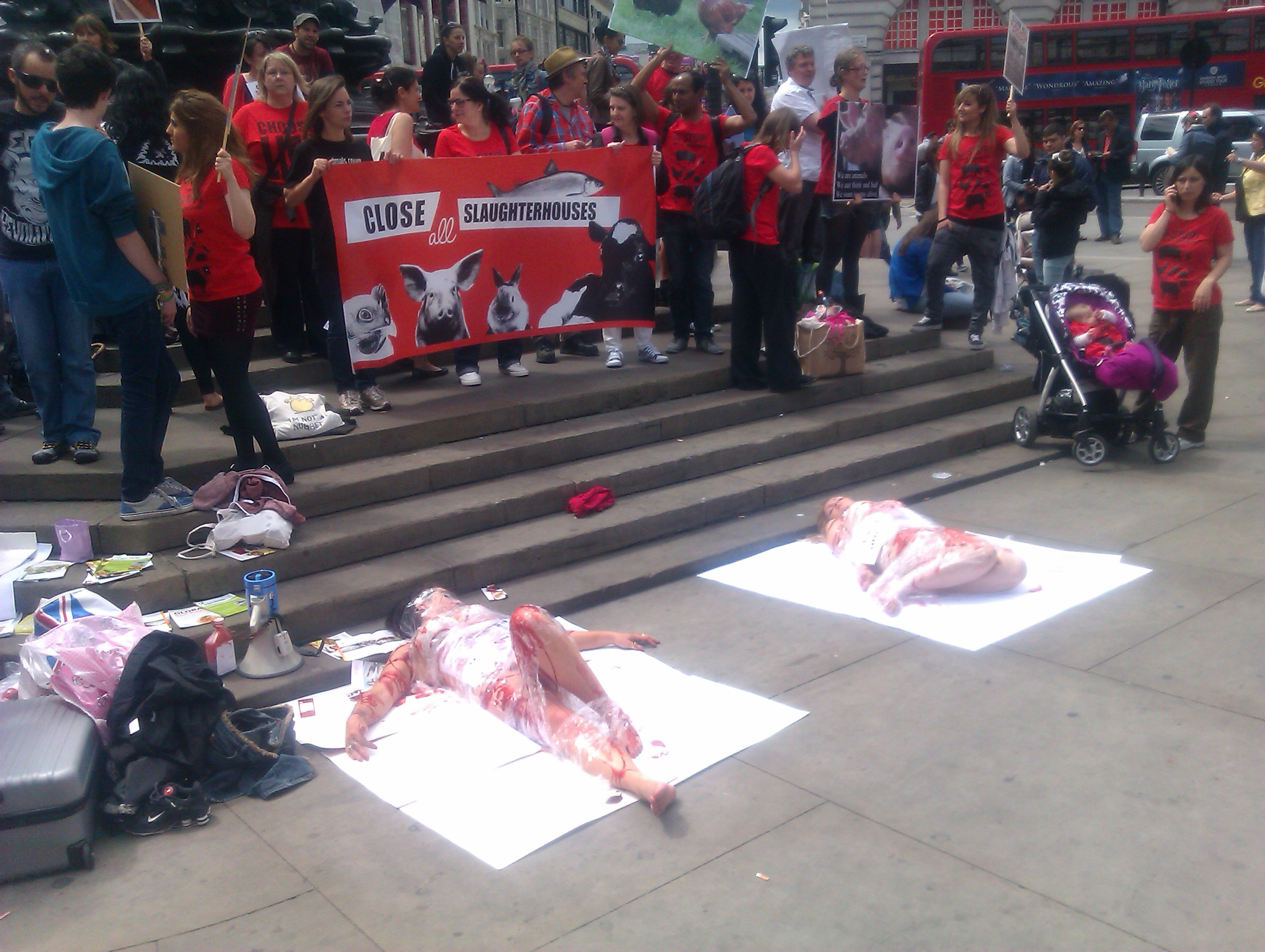 This event was organised and supported by Animal Equality, Animal Aid, and the Vegan Society, amongst others, who are campaigning against the cruelty animals are subjected to within the commercial farming process, and the killing of animals (in slaughter-houses and elsewhere) for human consumption. As Buddhists and Socialists we attended in the spirit of solidarity, representing Animal Voices Torbay, a group that does much to help animals locally. This event occurred simultaneously around the world including London, Toulouse, Toronto, Istanbul, Zagreb, Houston, Sao Paulo, Rio de Janeiro and Bauru in Brazil. A similar demonstration in Paris happened on the 25.5.13.
