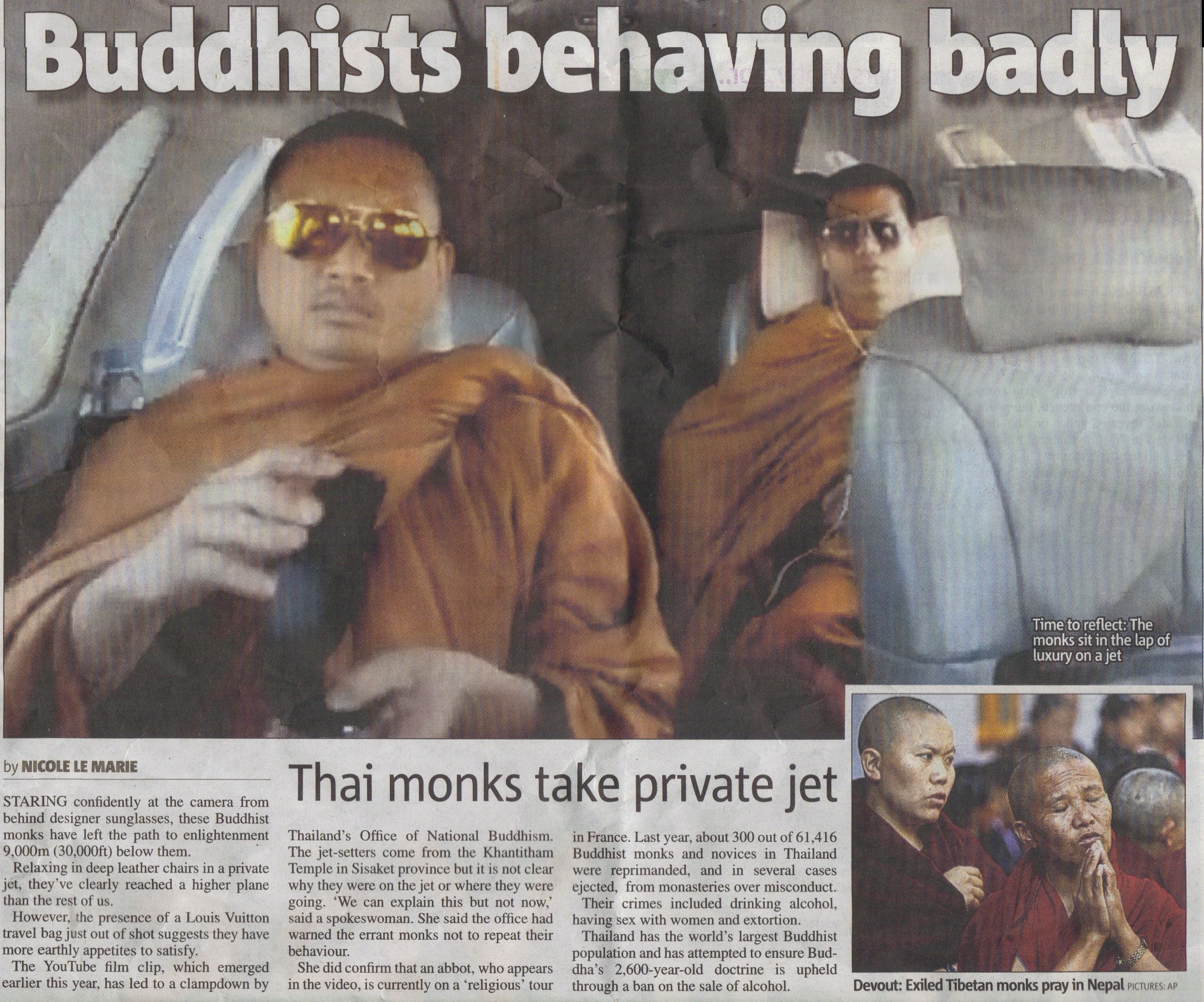 The above article entitled ‘Buddhists Behaving Badly’ appeared on page 3 of the Tuesday edition dated the 18.6.13. Astonishingly, this story takes up around three quarters of a page. It is not an original, or even a new story, but rather a report lifted from Youtube. The story evolves around apparently high-ranking Thai Buddhist monks flying in private jets, and wearing designer sunglasses. It may or may not be a troubling story for Buddhists, but the Metro reporter responsible for the story – Nicole Le Marie – demonstrates no knowledge of either Buddhist or Thai culture. The story is presented as a glimpse into the odd and exotic world of the ‘other’, where foreign religions – which implicitly must not be taken too seriously – are presented as inherently corrupt and beneath contempt. The reporter states: “Time to reflect. The monks sit in the lap of luxury on a jet.” As if as a means to subconsciously convey the fact that the journalist has no real knowledge of the subject of her report, she bizarrely inserts a photograph of a completely unconnected event what is claimed to be ‘devout’ Tibetan Buddhist monks living in Nepal! The inherent corruption suggested in the story is contradicted by the fact that the reporter states: “Last year, about 300 out of 61,416 Buddhist monks and novices living Thailand were reprimanded, and in several cases ejected, from monasteries over misconduct.” If only ‘300’ were reprimanded out of 61, 416, this suggests that only 0.48% of the entire Buddhist monastic population had any need to receive corrective measures. This means that 99.52% of the Buddhist monastic population of Thailand last year adhered perfectly the vinaya rules with no problem at all. As for correcting monks and novices (nuns are not mentioned in the article), this is a procedure that has been practiced since the time of the Buddha himself. Training in the Dharma (a word that does not appear once in the article) is predicated upon the idea that aspirants require correction. This is a senseless article written by a narrow minded, Eurocentric reporter, who possesses absolutely NO genuine knowledge of the subject at hand. If the reporter had any knowledge of Buddhism she would know that there are no rules contained in the vinaya about wearing sunglasses, travelling in aeroplanes, or carrying particular types of bags.