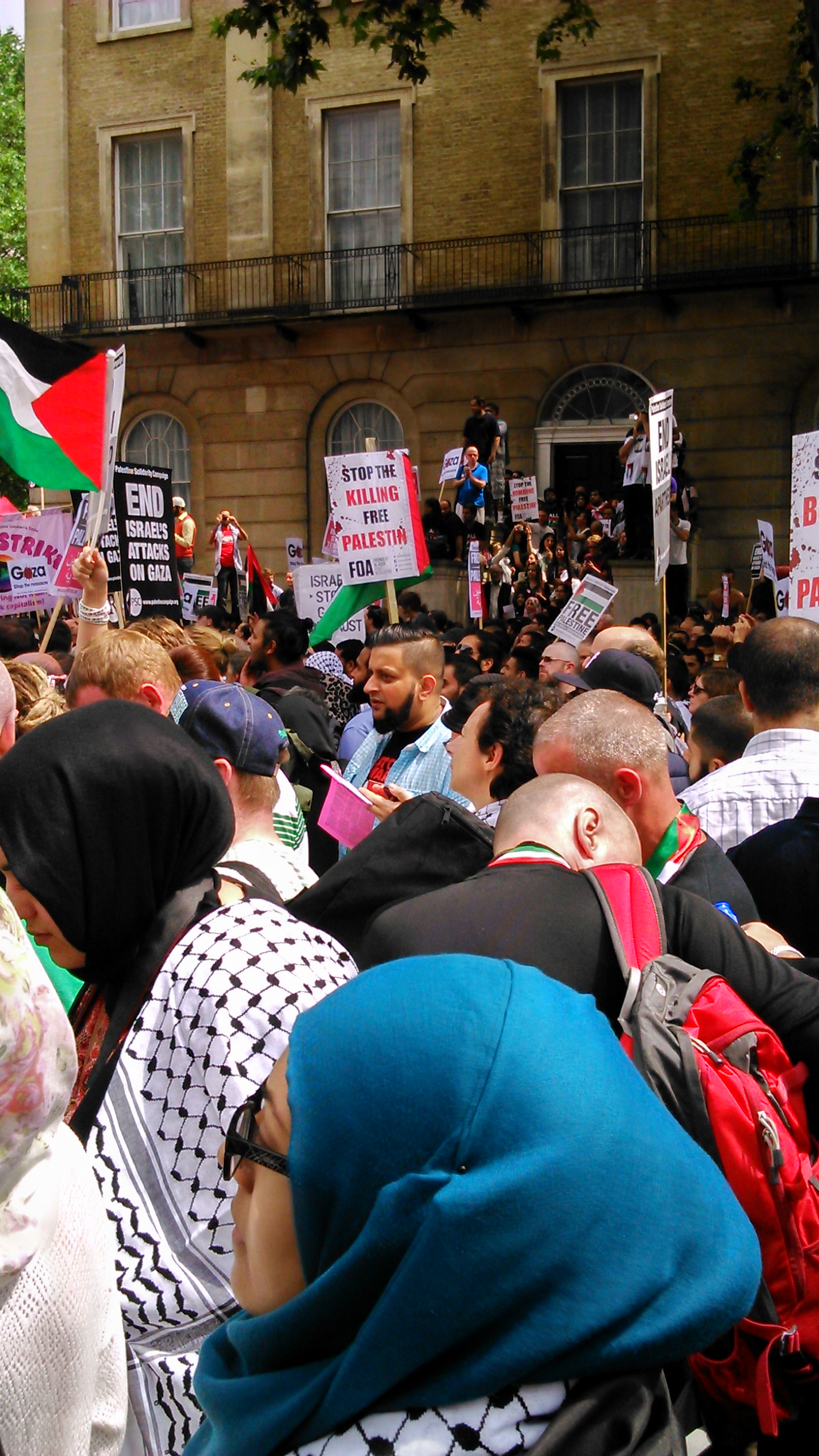 This ongoing situation of Israel doing whatever it wants to do with impunity, led today to thousands upon thousands of British people gathering outside Downing Street, and marching to the Israeli Embassy via Hyde Park and Kensington Gardens, in temperatures of around 30 degrees. British Muslims from various ethnic groups and cultures joined Palestinians, people from other countries, and many other British people, young and old, male and female, able-bodied, and disabled. Despite a strong police presence, there was no reported trouble.