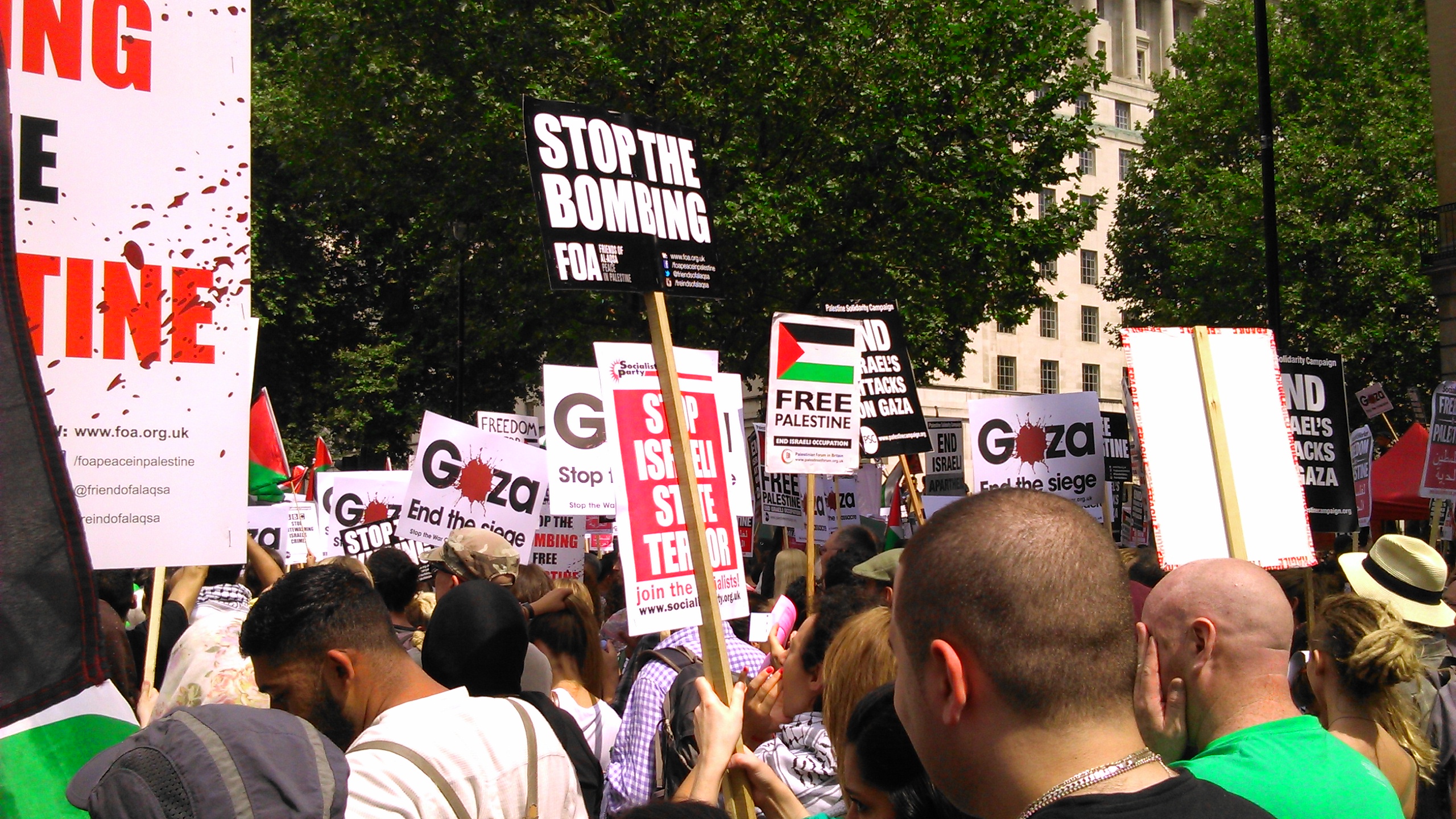 Along the route, occasionally devout Muslims would move to the side of the pavement, or step into a local park and unroll their mat for prayer, while the elderly and those with disabilities still made their way along the route, even though they had fallen behind the official police-line marking the rear of the march, and were even behind the army of well organised road-sweepers whose job it was to clean-up the streets in its wake. Placards and posters routinely called for Gaza to be free, and for Israel to change its policy and stop behaving in a fascist, and highly destructive manner. Despite the continuous pro-Israeli British media, and total lack of impartiality from the BBC, it is obvious that their propaganda is not working. Multitudes of intelligent and right-minded people marched through London, demonstrating that no matter who has control of the state media, reality will still seep through into the human mind and protests against lying and oppression will instantaneously emerge from the masses.