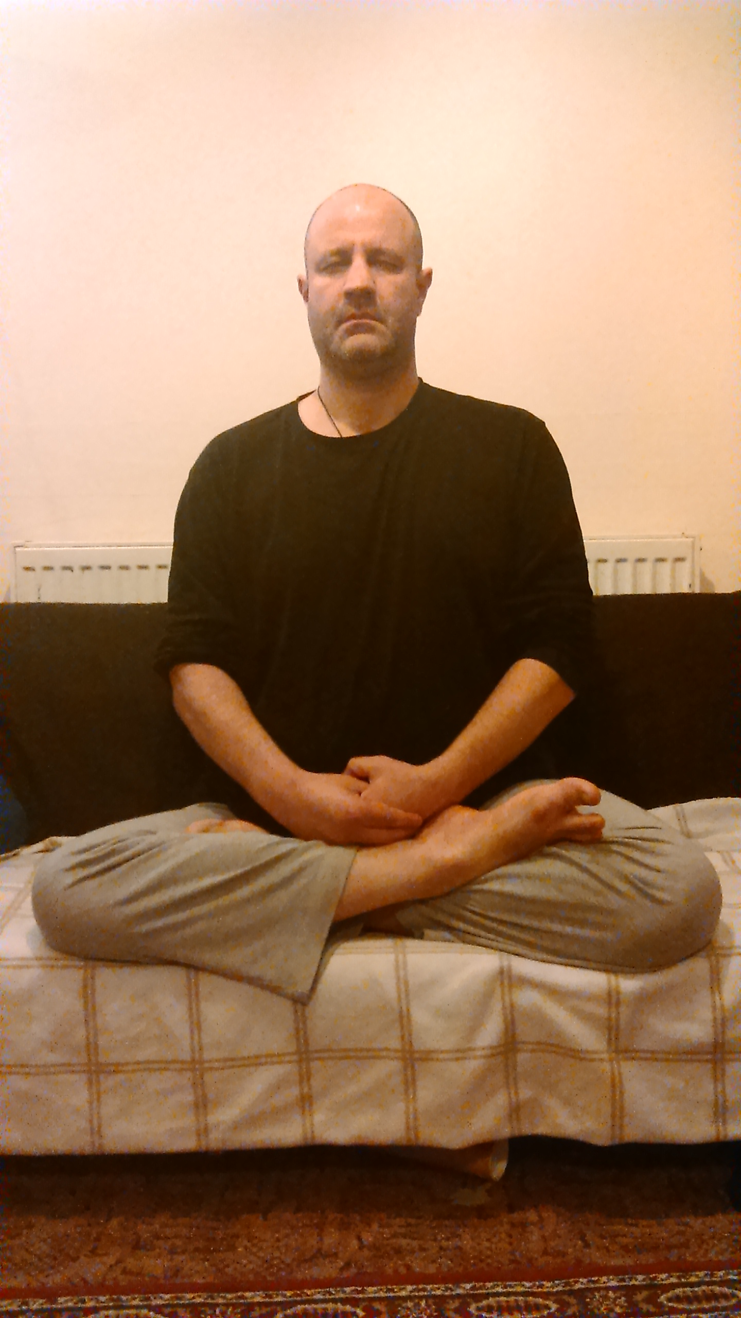 ‘The left-hand rests palm-up on the palm of the right-hand, with the thumb of the left-hand touching the tip of its middle-finger. Simultaneously, the thumb of the right-hand presses the centre of the right-palm. This connects the circuit of Yin and Yang energy in the body.’