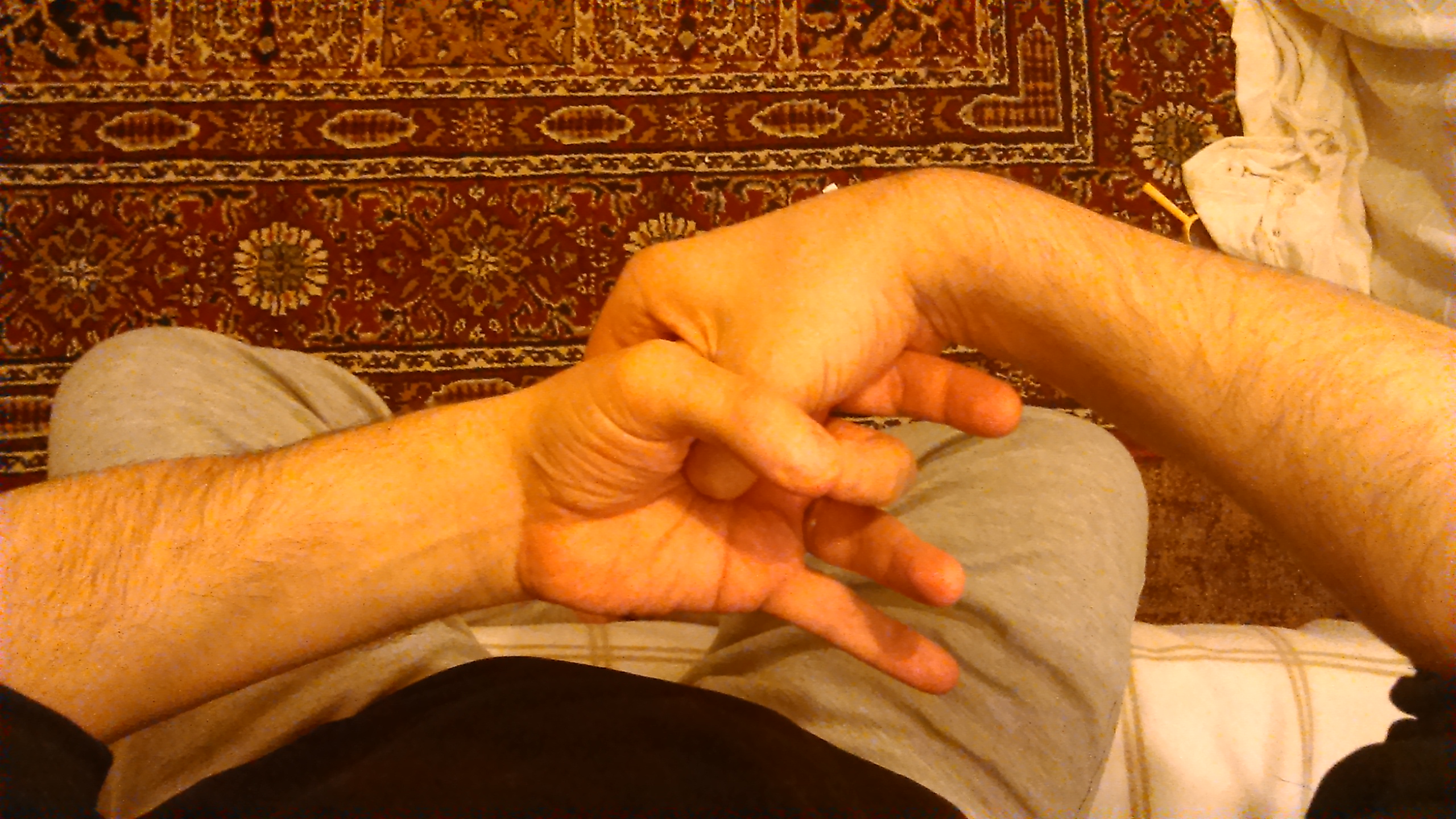 The phrase ‘手掐子午’ simply translates as ‘Close the meridians of the hands’, which in and of itself, tells use very little about the practice itself. This is typical of the Chinese Daoist tradition which requires a careful instruction received from a qualified master. The hand positions look like this: