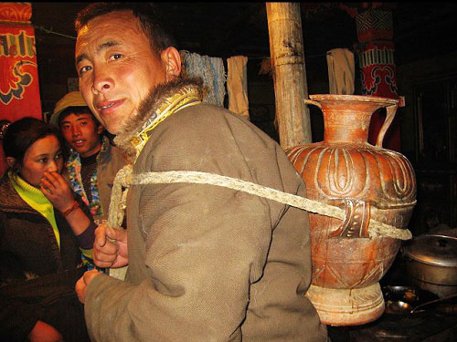 On Tibetan New Year’s Day – one of the first activities involves the ‘Water Grab’. At dawn, women head to the nearest well or river carrying buckets. The buckets are wrapped in white Tibetan prayer-scarves, which represent ‘good luck’. The well or riverbank is decorated with prayer scarves, burning incense sticks, cards, and various over gifts – all designed to ensure that the water gathered is full of good luck. People run to the water source because whoever can scoop-up the first container of water – gains the largest amount of good fortune. When the women return to their homes with the collected water, they change into their festive costumes, and the eldest woman in the house takes the water to the family shrine, (to be placed in special bowls) as an act of respectful worship to the Buddha and various other deities. According to custom, only women can perform this important task and men are not allowed to participate. If a man runs to the river or well, he will attract the ridicule of his neighbours, and the women consider this behaviour incorrect and unvirtuous. Today, however, many Tibetan homes possess running-water, and it is the domestic-tap that is decorated with prayer-scarves, incense sticks, and other holy gifts, and from which the water is collected.