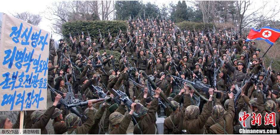 由朝中社3月3日公布的照片显示,朝鲜士兵手举枪支喊口号,斗志昂扬,誓死维护国家尊严。