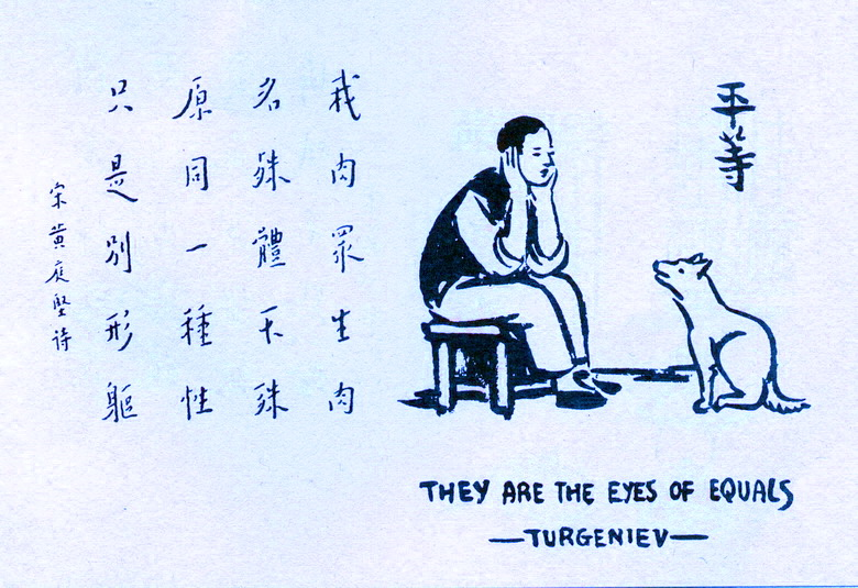 Translator’s Note: The following is a poem about ‘equality’ written by the Song Dynasty poet – Huang Ting Jian – which has been set to a picture of a human being looking at a dog – and a dog looking at a human being. Although the human seems ‘higher’ than the dog, in fact both are ‘sat’ down in a submissive manner, implying a certain ‘equality’ to proceedings. Furthermore, for reasons not explained in the original Chinese language article, there is a quote attributed to ‘Turgeniev’ in English, which I assume is actually the Russian novelist Ivan Turgenev (1818-1883). At first glance this seems an odd association, as Turgenev was a renowned hunter of animals. ACW 12.4.15