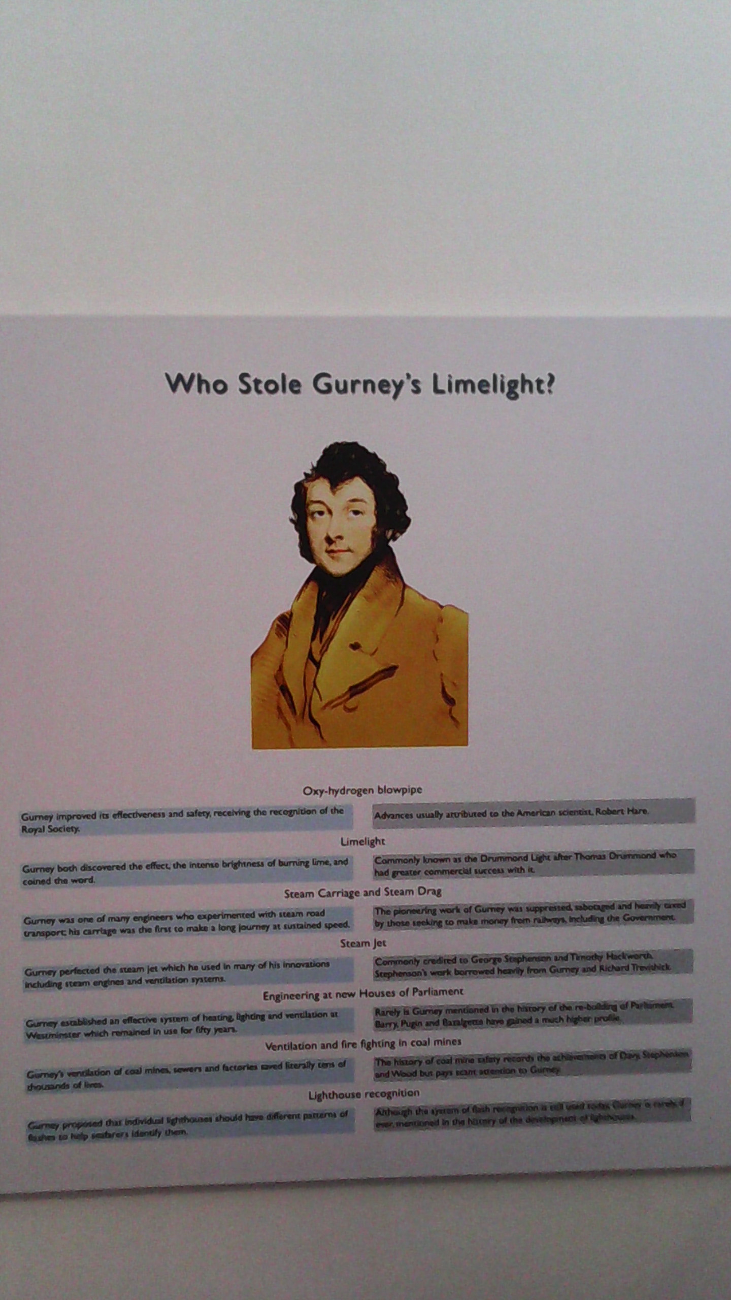Bude Castle is not a ‘castle’ as such, but a modest stately home situated in Bude – north Cornwall – that was once the home of Goldsworthy Gurney (1793-1875). Goldsworthy Gurney was born in Padstow (Cornwall) and was something of a genius. He was educated at Truro Grammar School, and despite not going to university, he apprenticed with a local medical doctor, learning how to be a general practitioner, and eventually inheriting the practice as a surgeon before he was 20 years old. However, he longed to experience life in London – one of the most progressive cities in the world – and in 1820 he and his family relocated to the city. He began to meet with, socialise with, and debate with the leading scholars of his day, where he had a chance to explain many of his scientific ideas. His obvious genius led to him being elected a member of the Surrey Institute, and in 1822, he became a lecturer in chemistry and natural philosophy – subjects he must have thoroughly learned at school to a high degree. This triggered his scientific insight and he is known for the following inventions; a) (1823) High Pressure Steam Jet – used to improve the functioning of steam engines, as well as ventilate mines sewers. b) (1824) The Oxy-hydrogen Blow Pipe – which safely burnt explosive gases, and assisted the application of chemically produced heat during the manufacturing process. c) (c. 1830’s) The Bude Light was a replacement for candles which produced light through the fusion of magnesia and lime. The lit Bude Castle, and was later commissioned in London to light the Houses of Parliament, Trafalgar Square (where an example can still be seen), and Pall Mall leading to Buckingham Palace. This lighting system was also used in light-houses. d) (1863) the Gurney Stove was designed to warm and moisten the air. It was used in Bude Castle, and later churches and public beings. He was not only a pioneer of steam trains that ran on rails, but also of steam powered automobiles (in effect the first ‘cars’ in the world) that could run on public roads instead of rails In 1863 Goldsworthy Gurney was knighted by Queen Victoria.
