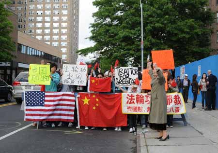 Many Chinese people oppose the Falun Gong and I shall explain why. In the above picture (taken in May, 2008) an 80 year old Chinese person in New York berates a group of Falun Gong protestors stating that they should be ashamed of themselves, stop attacking their ancestral country, and learn about true Chinese culture! This is because the Falun Gong movement is a dangerous, politically motivated ‘cult’ that recruits gullible Chinese and Western people in its attempt to usurp the legitimate government of the mainland of China. In the Chinese language, Falun Gong is written ‘法轮功’. This translates as:
