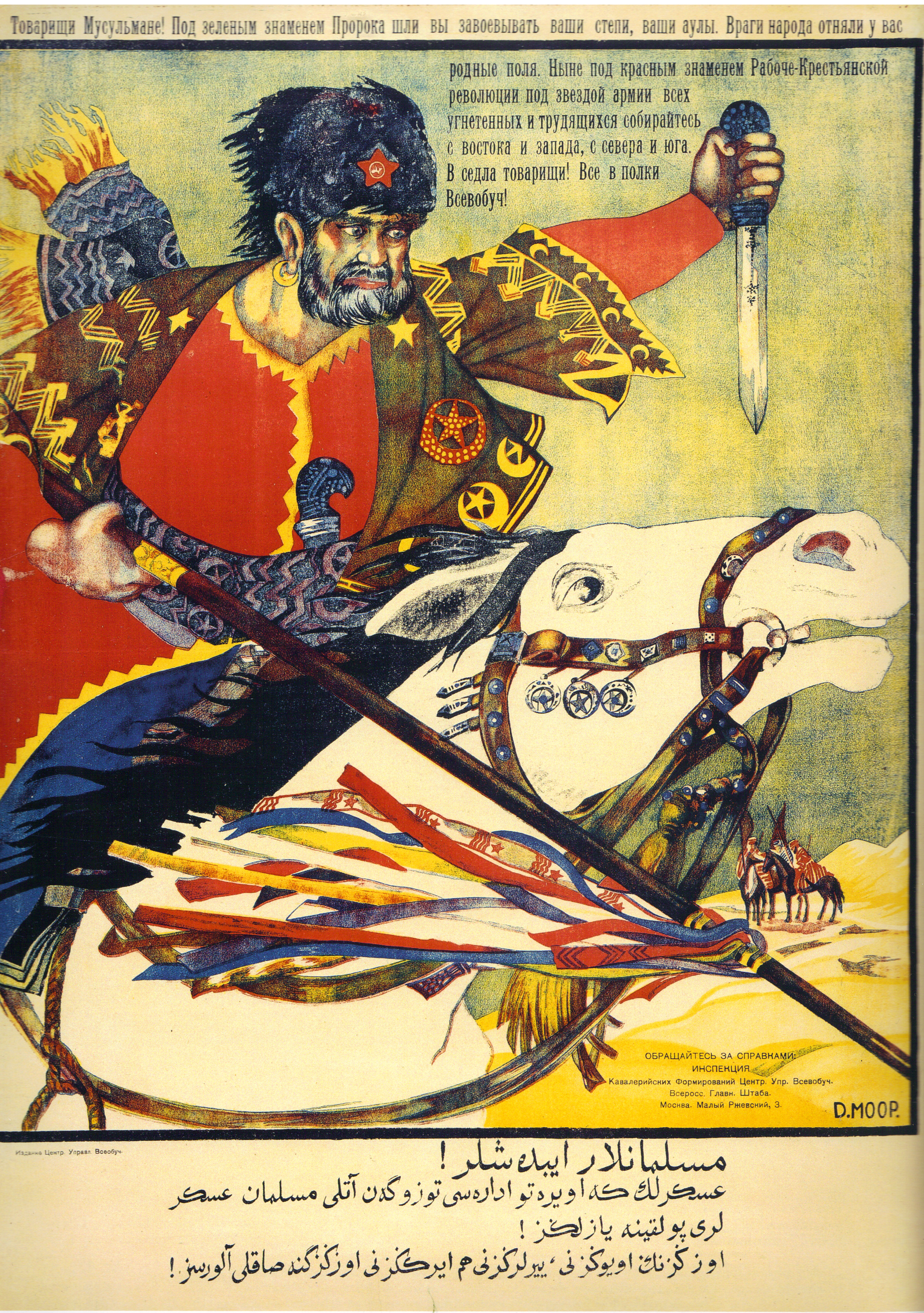 Following the Russian Communist Revolution of 1917, the bourgeois forces of the West (together with Imperial Japan), launched an invasion of the fledgling Communist State that became known as the Russian Civil War (1918-1921). The USA and Europe wanted to return Russia to a backward feudal system that they could easily control, but the newly formed Red Army countered this threat and eventually drove the capitalists out of Russia and the Soviet Union. This poster (printed in Russian and Turkic Tartar) is calling upon Islamic horsemen to join the Red Cavalry and defend the Communist Revolution by driving the capitalists out from their homelands.