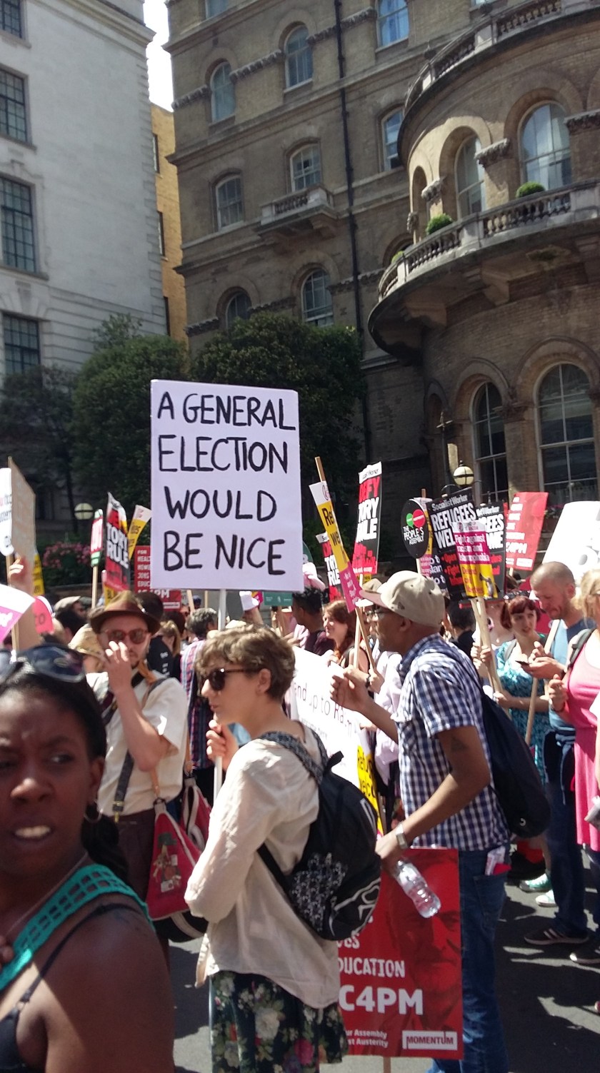 This weekend was the Tolpuddle Martyrs’ Festival, which is held every year in July, to commemorate and celebrate the bravery of a group of unionised farmers from West Dorset, many of whom were persecuted by the State for daring to oppose capitalist oppression (in 1834). Those Socialists and Communist who were not in Dorset today, attended the People’s Assembly Anti-Austerity, Anti-racism and Anti-Tory protest March that started at 1pm (outside the BBC in Portland Place), and which meandered its way through Central London to Parliament Square. Tens of thousands attended from all different backgrounds and there was an air of jubilation in a crowd that expects the Socialist Jeremy Corbyn to be re-confirmed as the Leader of the Labour Party, and eventually to become Prime Minister of the UK. In the meantime, the demonstrators passed Downing Street calling for the new Tory administration (led by Theresa May) to call a general election. Black Lives Matter was present and quite rightly vocal, calling the crowd’s attention to the often racist and deadly behaviour of the British police, described as the arm of the faceless State, empowered by racist White people to kill Black people whilst in custody, or during arrest, etc. Mixed in with all this was the NHS Staff marching to keep Nursing and Midwifery Bursaries, and to prevent further cuts and privatisation of the NHS itself. In the light of the recent UN Report slamming the British government for Crimes Against Humanity regarding its despicable treatment of the nation’s disabled people, Disability Rights Campaigners were quite rightly out in force. Whilst waiting in the 27 degree heat, a Comrade from the Communist Party of Britain (CPB), approached and said that he recognised us due to our excellent flags. He then presented us with a gift of a unique Marxist postcard of his own design which can be seen below (the contact email for this art is – mina_boromand@hotmail.com):