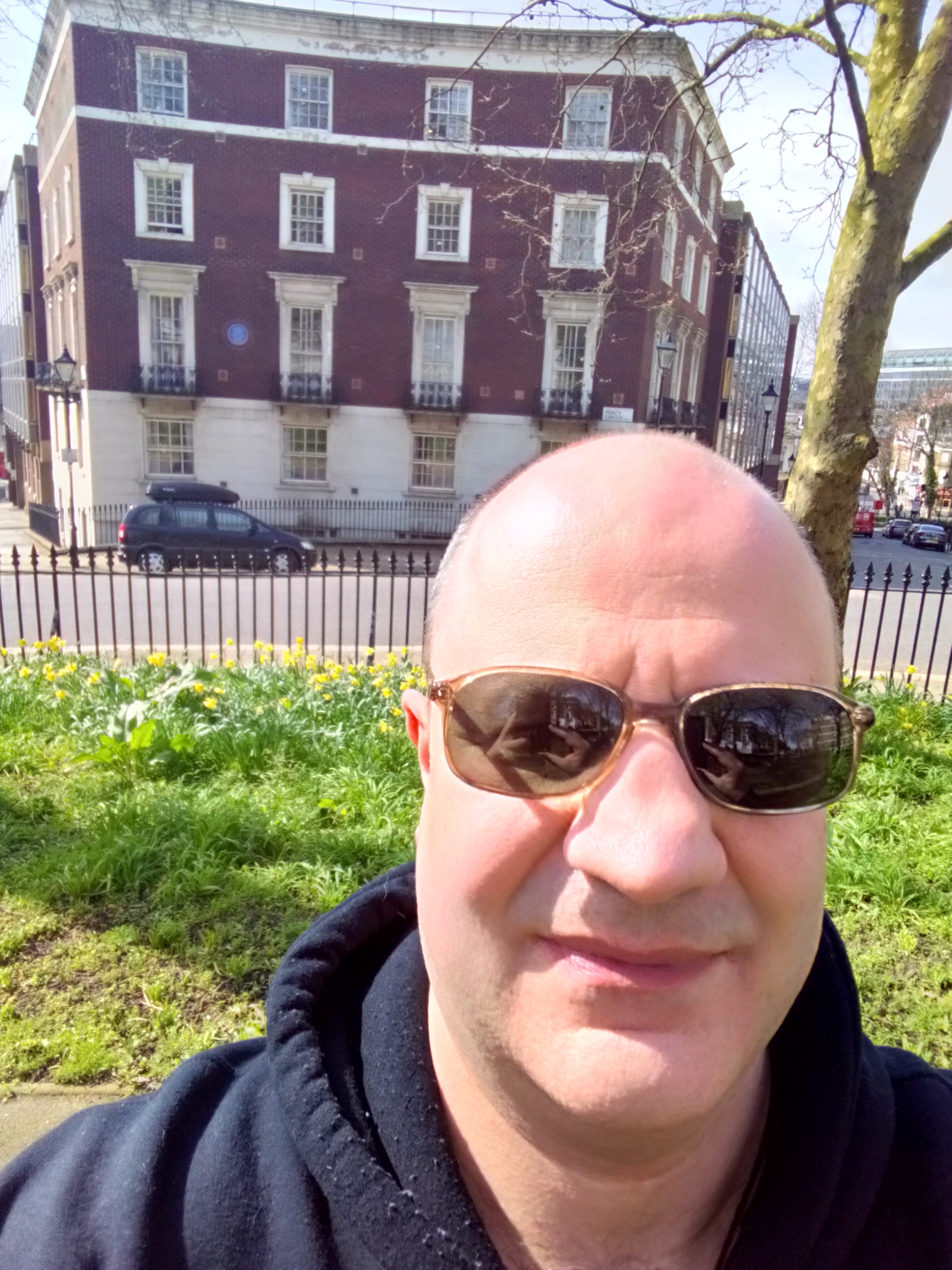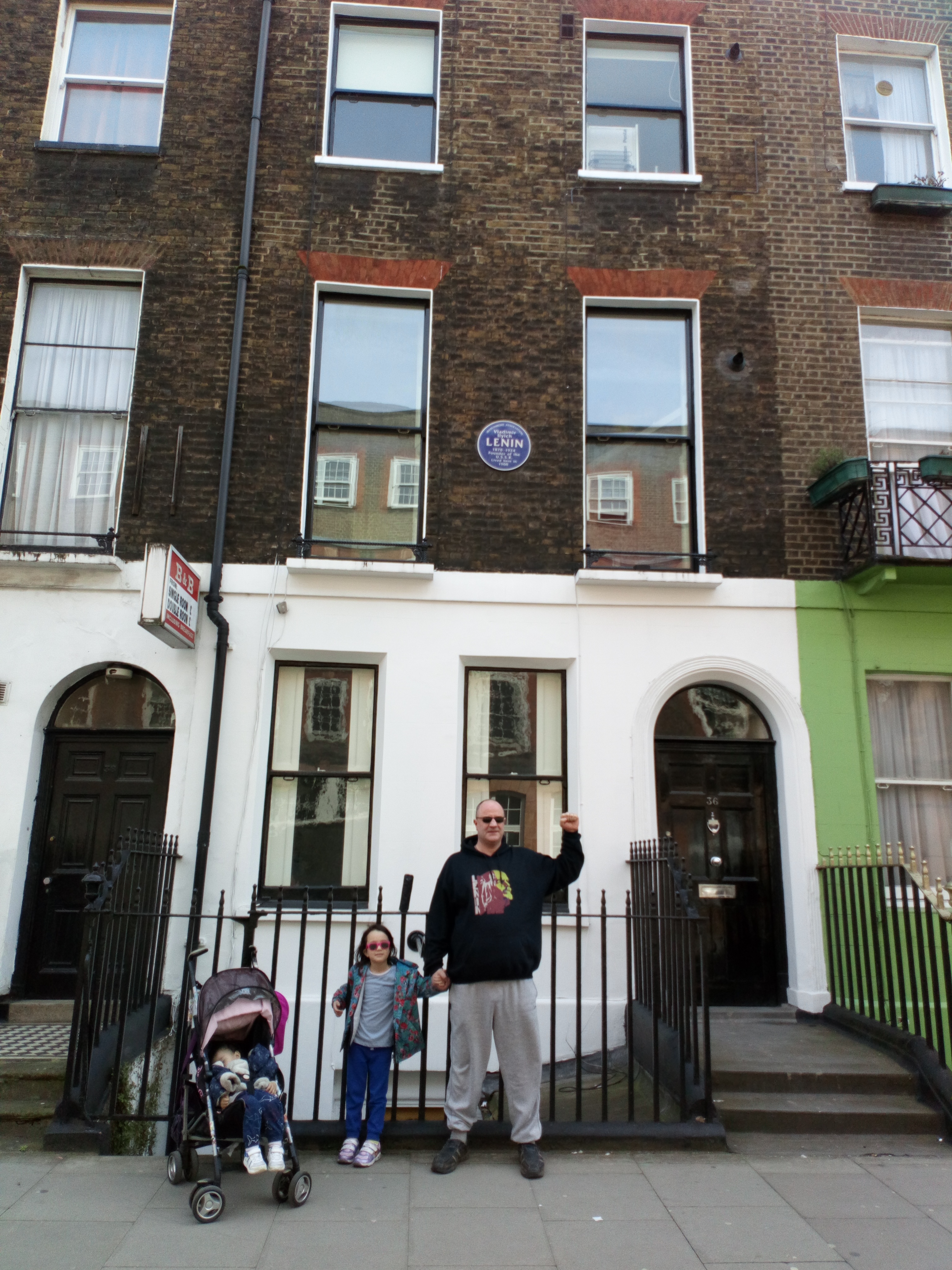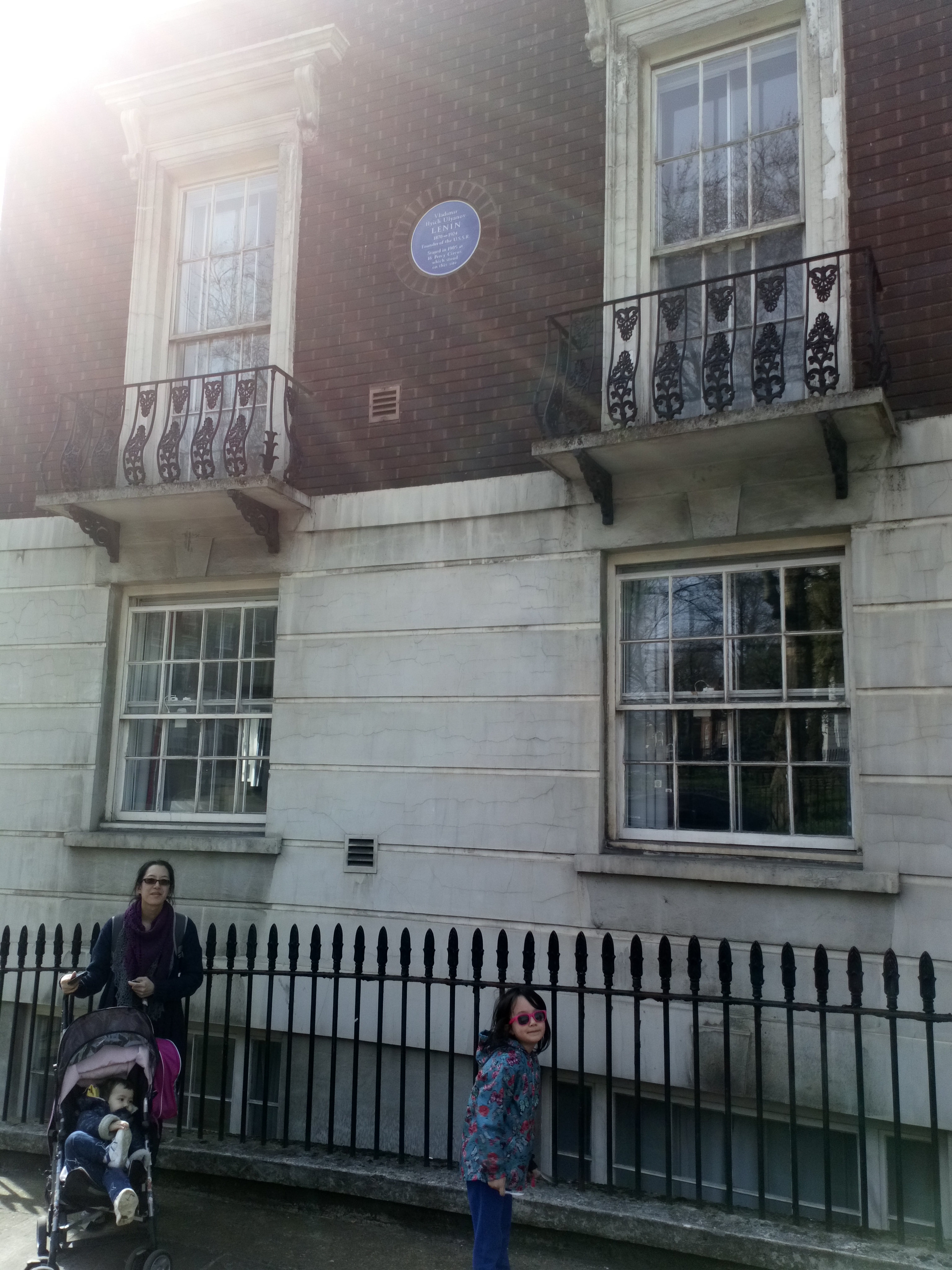 After some lunch at a lovely local cafe around 10m from the Lenin plaque, we then walked for about 20 minutes into the Camden area of London (through a small Regent’s Park opposite a Housing Estate), and then turned right and up the hill of Great Percy Street. At the top of this short hill is Percey circus – consisting of a small, rounded park in the centre, and rows of houses arranged around it in a circle. Although the original house (at 16 Percey Circus) that Lenin stayed in is long gone, a blue plaque is affixed to the new building marking the old spot. Although I cannot be sure, I am told Lenin might have sat in the little park directly opposite his lodgings making notes, compiling speeches and reading Marx:
