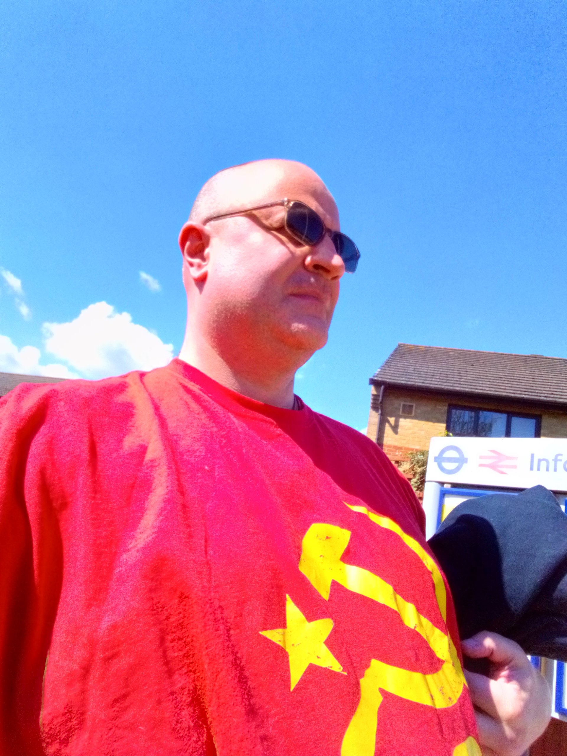 We were greeted by two Russian nationals visiting the UK who posed for photographs with me, my T-shirt and our large Red Flag! They explained that life was much better under the Soviet System and that the Russian people today are suffering terribly under capitalism. They expressed sympathy and understanding for the plight of Donetsk. This was followed by two very elderly people (a man and a woman) who came over and read the Russian language on the Donetsk flag. At first they were confused, but when I explained Donetsk was in Eastern Ukraine, their faces lit-up and they smiled with happiness! I was then confronted by a Trotskyite Eastern European who asked me why I was marching with a foreign flag, and why no one from Donetsk was present? This is the kind of ignorant ‘entryism’ Trotskyites use all the time to confuse and disrupt. I explained I was marching out of ‘Solidarity’ with the people of Donetsk, and that these very same people could not travel because their country is currently under military attack from the neo-Nazi ‘Maidan’ regime! I received no answer. I was next challenged by an elderly British woman who was also a Trotskyite, who said that Donetsk was a neo-Nazi stronghold attacking the peaceful ‘democratic’ ‘Maidan’ regime! One or two others also stated that President Putin had invaded Eastern Ukraine and was trying to cause a war with the ‘peaceful’ capitalist West! If I did not know any different, I would have thought that I had walked into a neo-Nazi rally designed to mislead the working class into believing myths and fairy tales for nefarious ends. Perhaps the worst manifestation of this ‘entryism’ was the racism aimed at Gee – my partner – when individuals (usually White Europeans) would walk up to me and whilst looking at Gee would ignore her and say to me something like ‘China isn’t Communist’ – and thinking they had made their point – walk away!