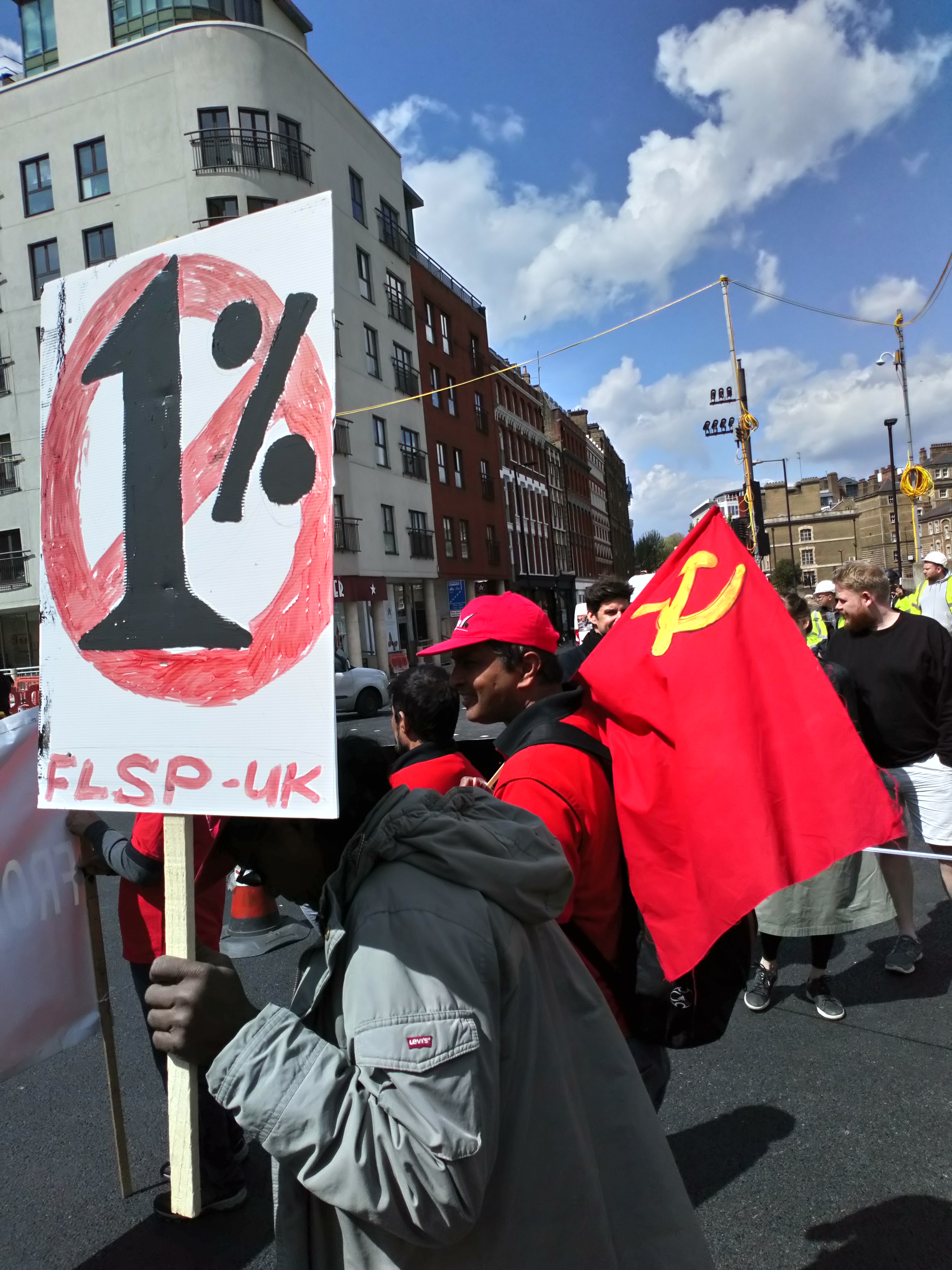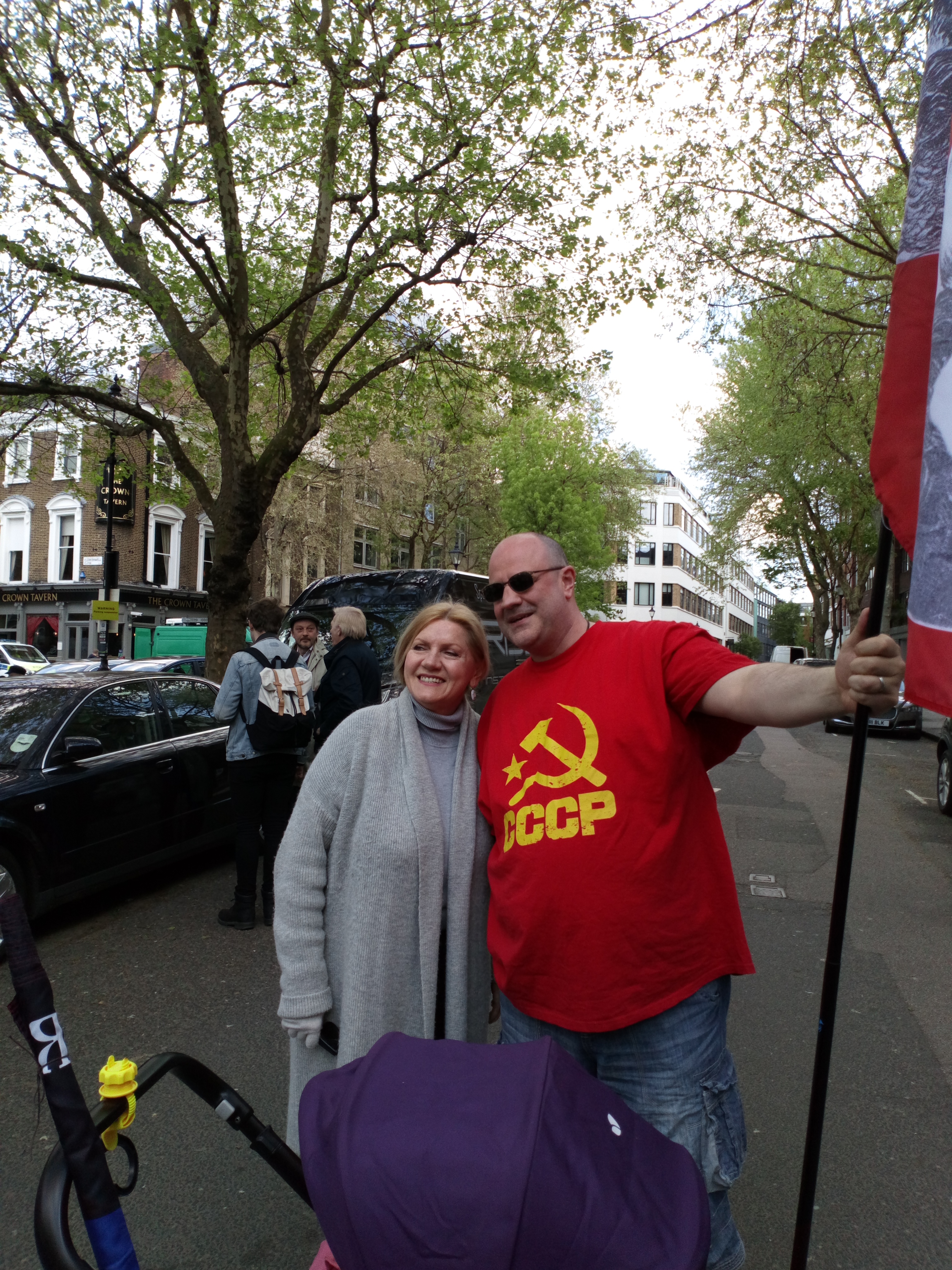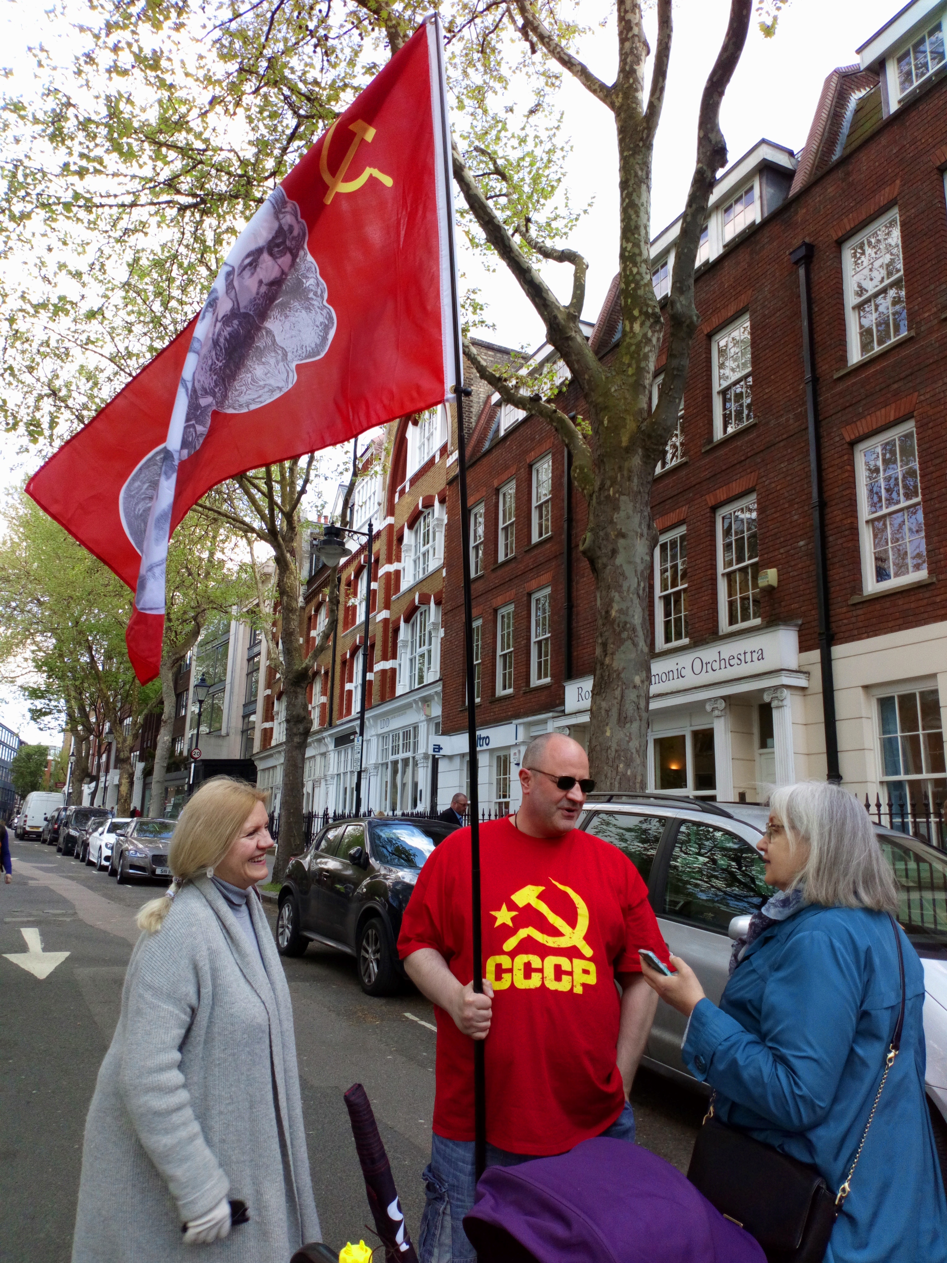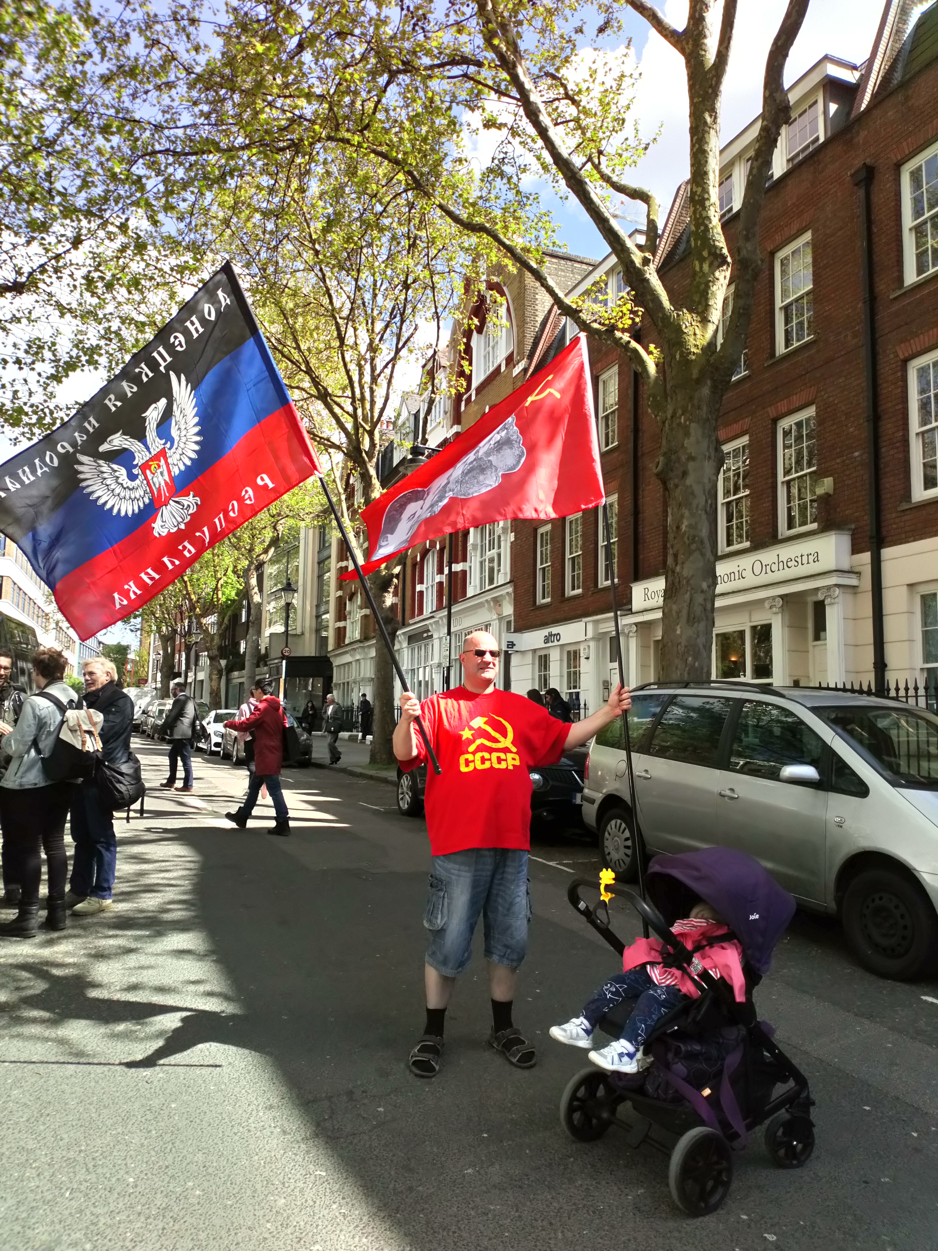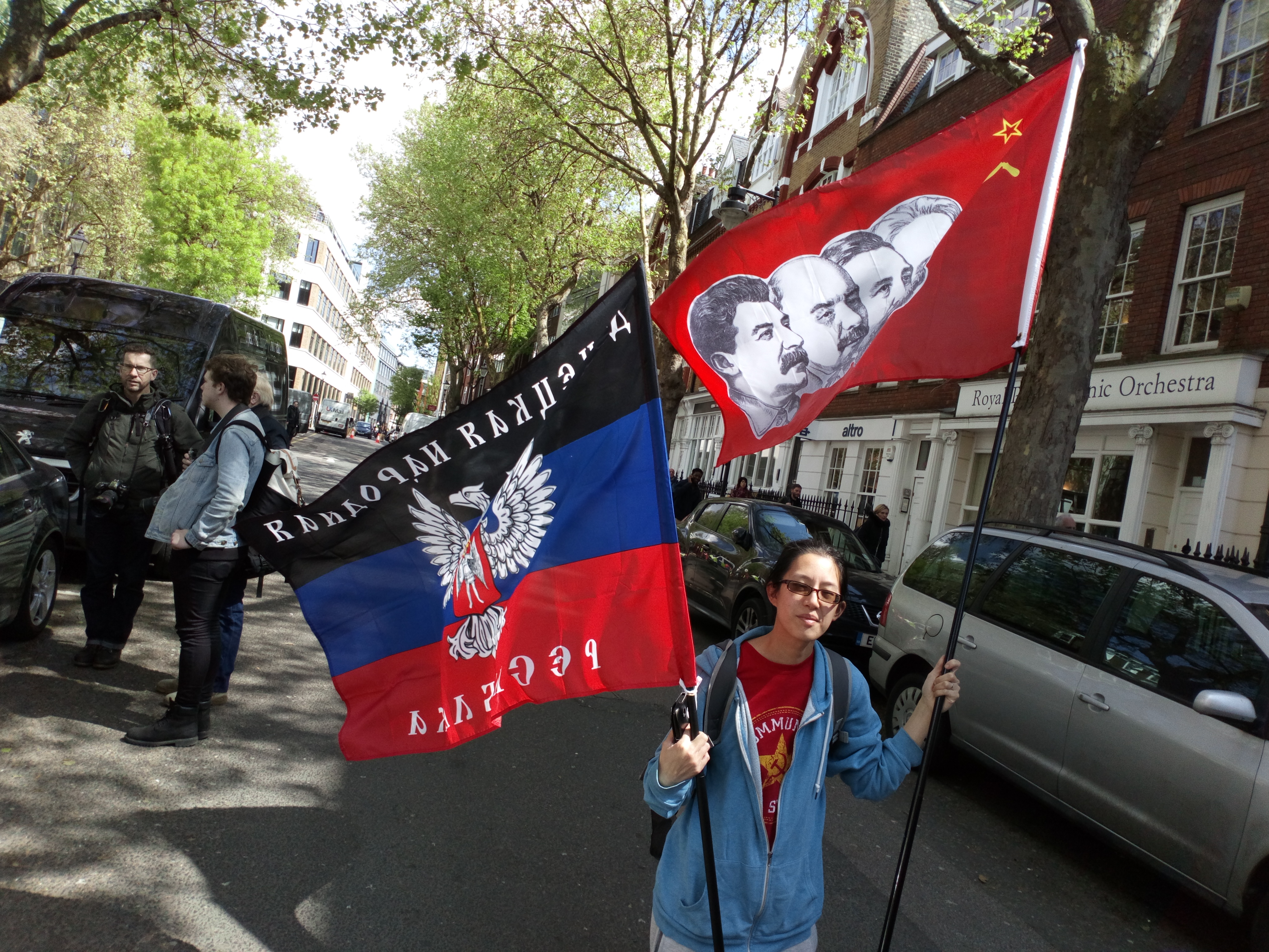 We marched as a family today – although our eldest daughter Mei-An was at school. She has marched in many processions over the years before she was even old enough to go to school. Today, on International Workers’ Day – Mei-An held-up the flag of the brave International Brigades that fought against German and Italian-backed fascism during the Spanish Civil War (1936-1939). As for ourselves, we made our way to Clerkenwell Green and raised our flags immediately opposite the Marx Memorial Library that was hosting an ‘open day’ (to which we had received an invitation). Being a weekday, there did not appear to have been as many as in previous years – particularly those marches held upon the weekend (the one where Jeremy Corbyn appeared was the best attended we had ever seen!). There were many different Marxist-Leninist groups from all around the world (including the Sri Lankan Front Line Socialist Party [Lanka] UK Committee with whom I had a very profound conversation). There was also the usual mix of confused, prejudiced and sometimes racist Trotskyites whose only purpose of being present was to disrupt and mislead the working class away from developing a true Marxist-Leninist mind-set. Although part of the CPB, we did not manage to locate the CPB banner at any part on the march -which is highly unusual. Nevertheless, we decided this year to carry a Red Flag featuring Marx, Engels, Lenin and Stalin, as we are opposed to revisionism and the misrepresentation of Soviet history through the false narratives perpetuated through US Cold War disinformation. The other flag we chose to carry through London was the banner of the People’s Republic of Donetsk (DNR) situated in Eastern Ukraine, and currently engaged in a life and death struggle against the neo-Nazi ‘Maidan’ regime, which is financed and armed by the US, UK and EU.