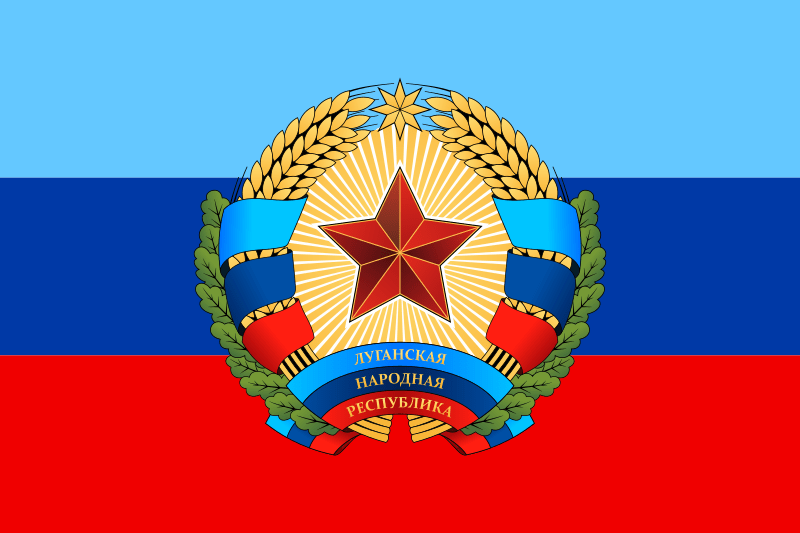 The People’s Republic of Lugansk is an independent Socialist State (in Eastern Ukraine), that was formed in 2014, when its populace rejected the Western-backed neo-Nazi take-over of Kiev (in Western Ukraine). Alongside the Donetsk People’s Republic, this region of anti-fascist resistance is referred to as Donbass, and its manifestation of Soviet Socialism as ‘Novorussia’, or ‘New Russia’. Although Donetsk has only had two flag designs, Lugansk has had several, with the basic three stripes of light blue, blue and red forming the ‘official’ flag, and the Red Star ‘Seal’ of Lugansk forming the most popular combinaion.