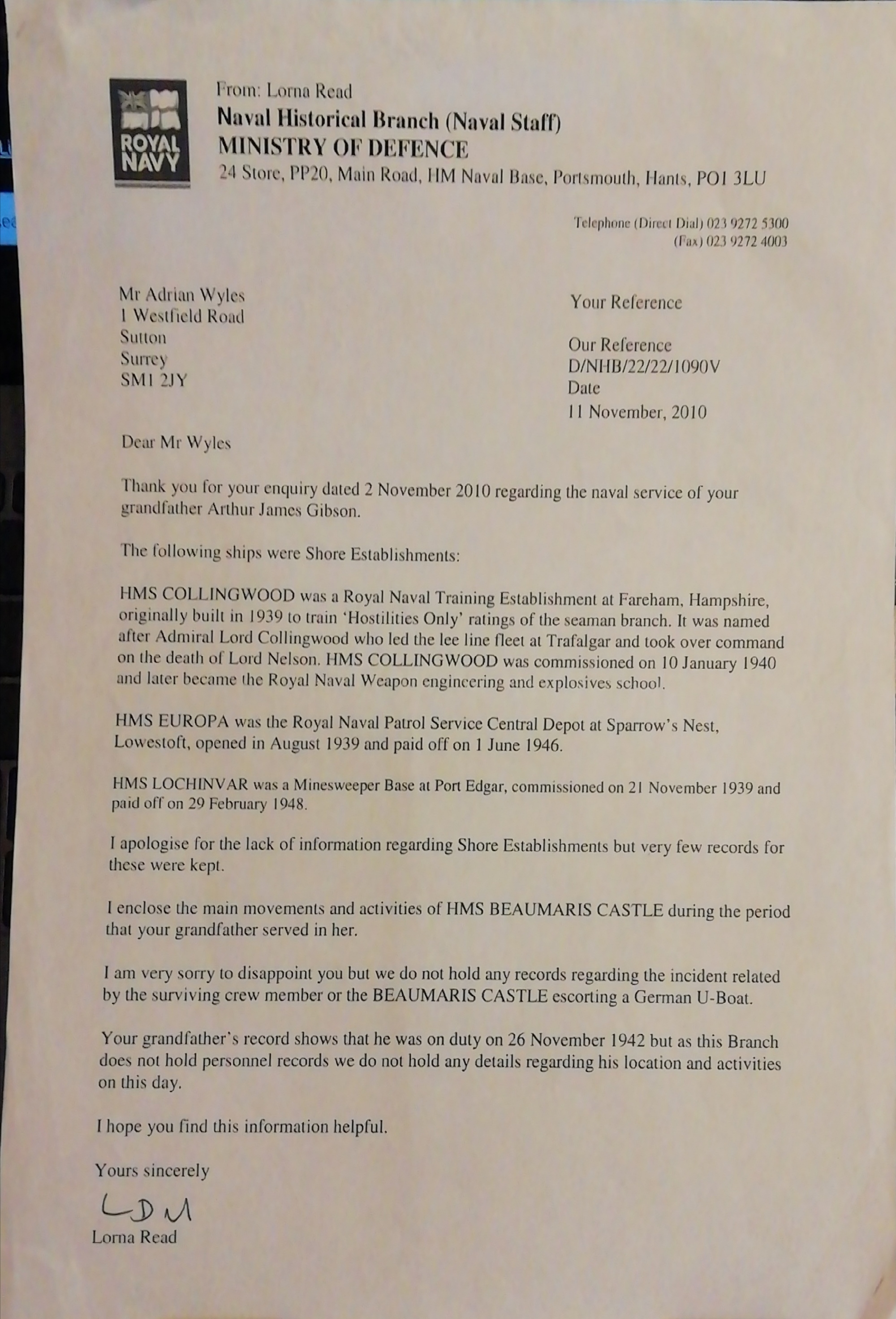 A subsequent enquiry to the Ministry of Defence by myself revealed that HMS Europa was the Royal Navy Patrol Group Central Depot land base at Sparrow’s Nest (Lowestoft), opened in August 1939, and decommissioned on the 1st of June 1946, whilst HMS Lochinvar was a Minesweeper (Land) Base at Port Edgar, opened on the 22st of November 1939 and decommissioned on the 1st of June 1948. The MOD also confirmed that it can give no further information about the hazardous duties my grandfather engaged in whilst serving on the HMS Beaumaris Castle and could not confirm or dent that such actions ‘took place’- but drew my attention to the date of ’26th of November, 1942′ when Arthur Gibson was engaged in carrying-out special ‘Duties’.