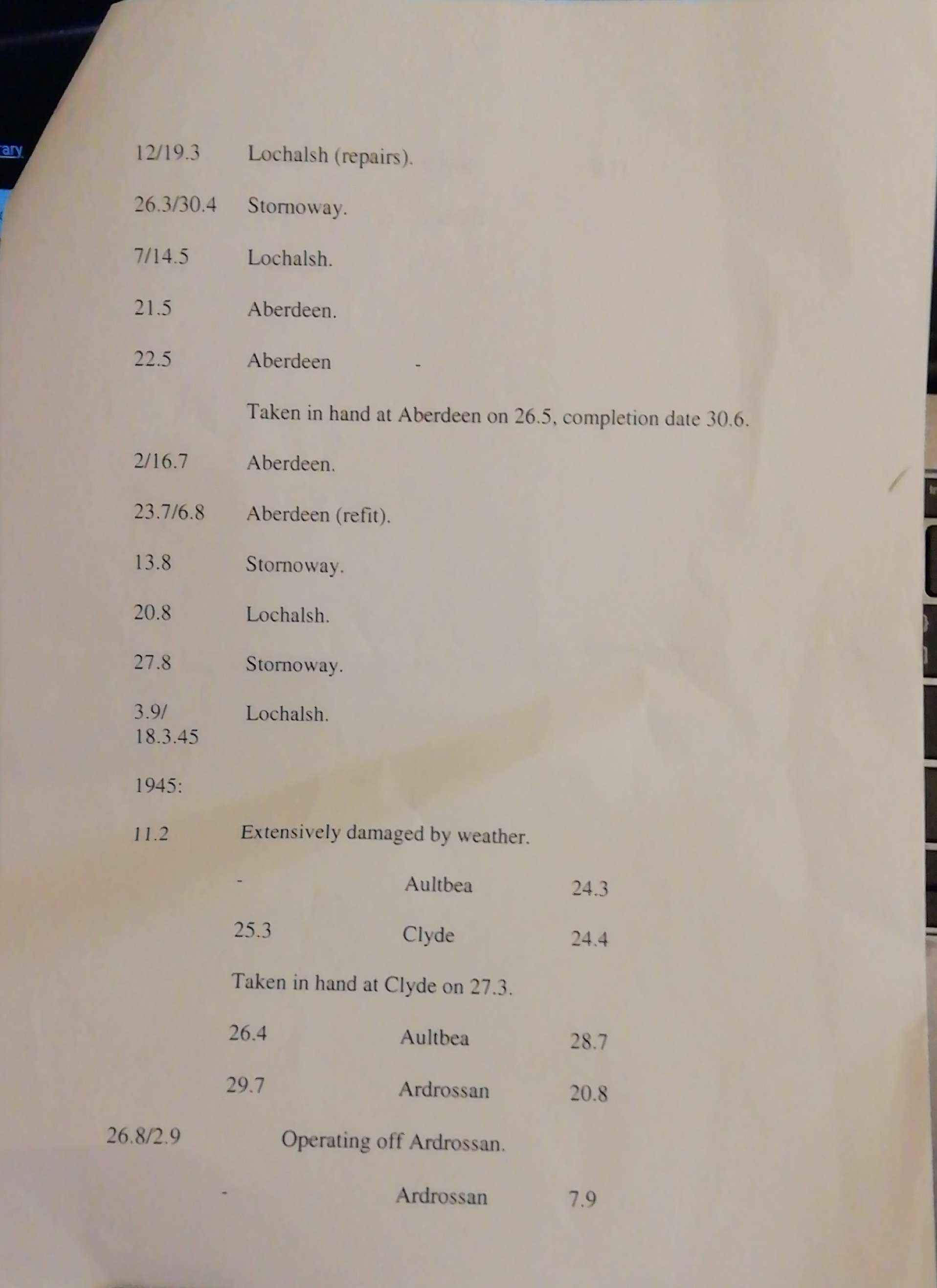 My grandfather said that at some point in the war, probably around Xmas time, a military aeroplane carrying either US or Canadian personnel home on leave, ‘hit an air-pocket’ and exploded over a remote Scottish island, killing all on board. The crew of the HMS Beaumaris Castle was diverted to this island (which Mr George Smith thinks was St Kilda), and volunteers (including my grandfather), were separated into teams of two and given a stretcher. Arthur Gibson was teamed with his best friend John Youngman (from Norfolk), and the two would recall the events of this night with a tragic humour after the war. A possible date for this episode is the 26th of November 1942 – as the War Record simply states ‘Duty’ (an RNPS code-word for any special activity involving armed or ‘hazardous’ service on land). For this time period, however, the log of the HMS Beaumaris Castle provided as part of Arthur Gibson’s War Record states that the ship was in dock for repairs at ‘Oban’ from the 9.11.1942 to 6.12.1942 – with the ship arriving in Stornoway on the 7.12.1942! What is interesting is how different parts of the War Record appear not to ‘agree’ or ‘match-up’ with other parts!