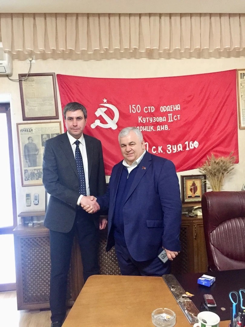 State Duma Deputy and Secretary of the Central Committee of the Communist Party of the Russian Federation – Kazbek Taisayev – visited the Lugansk People’s Republic to participate in the inauguration of the Head of the Republic Leonid Pasechnik. Also, Kazbek Kutsukovich visited the Office of the Communist Party – and together with the Party and Komsomol Activists – respecfully laid flowers at the Memorial Plaque of the first Head of the LNR – Valery Bolotov.
