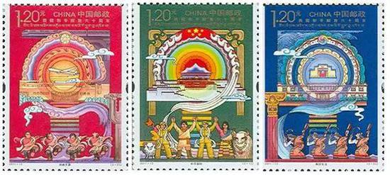 A set of three commemorative stamps celebrating the 60th Anniversary of the Peaceful Liberation of Tibet was issued on May 23, 2011.