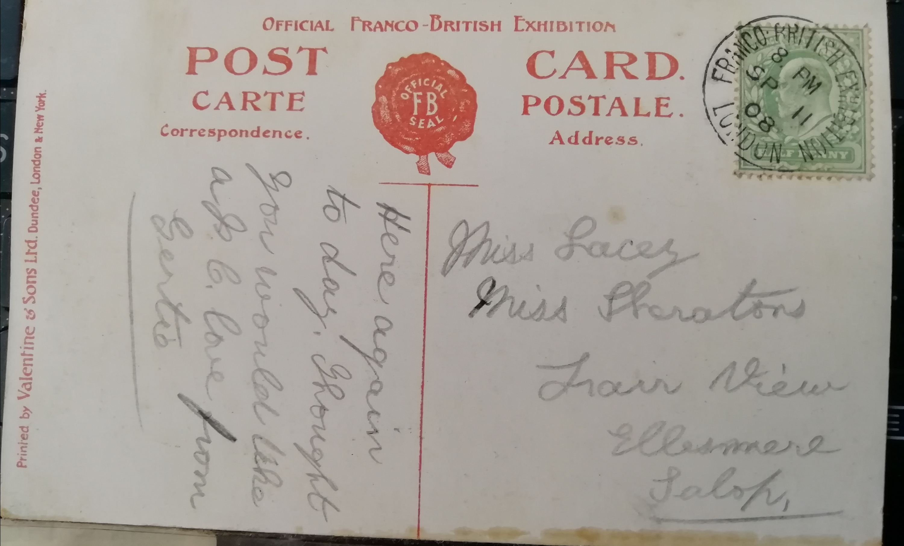 I was looking through an attic recently, and I came across this old postcard preserved in a plastic wallet and dated to Edward VII. The buildings remind me of those (similar follies) still visible in Brighton today, although those in the picture (below) are long gone. What was the ‘Franco-British Expedition’ of 1908, and what possessed the usually arrogant and self-assured British Authorities to place the name of ‘France’ first in an exhibition held on British soil?