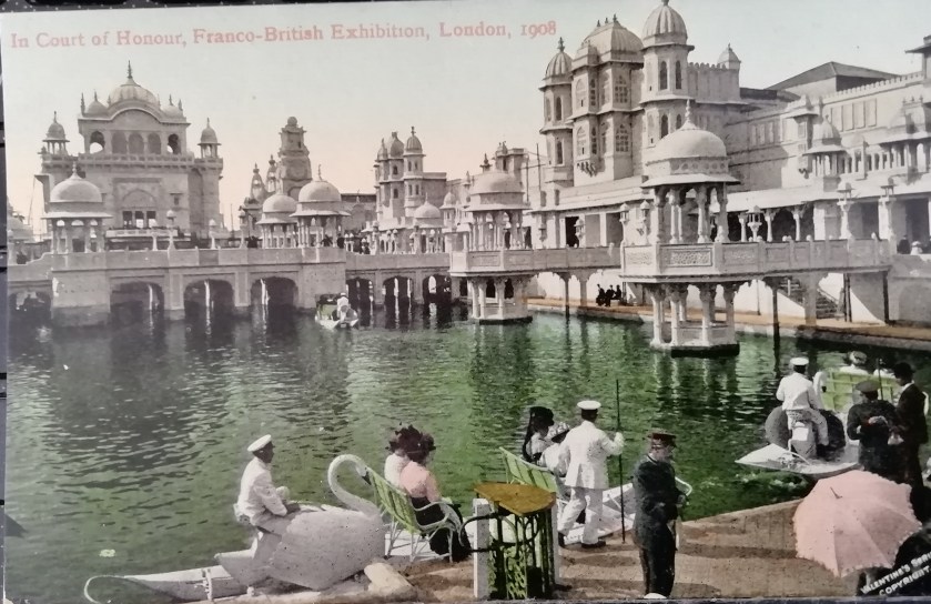 I was looking through an attic recently, and I came across this old postcard preserved in a plastic wallet and dated to Edward VII. The buildings remind me of those (similar follies) still visible in Brighton today, although those in the picture (below) are long gone. What was the ‘Franco-British Expedition’ of 1908, and what possessed the usually arrogant and self-assured British Authorities to place the name of ‘France’ first in an exhibition held on British soil?