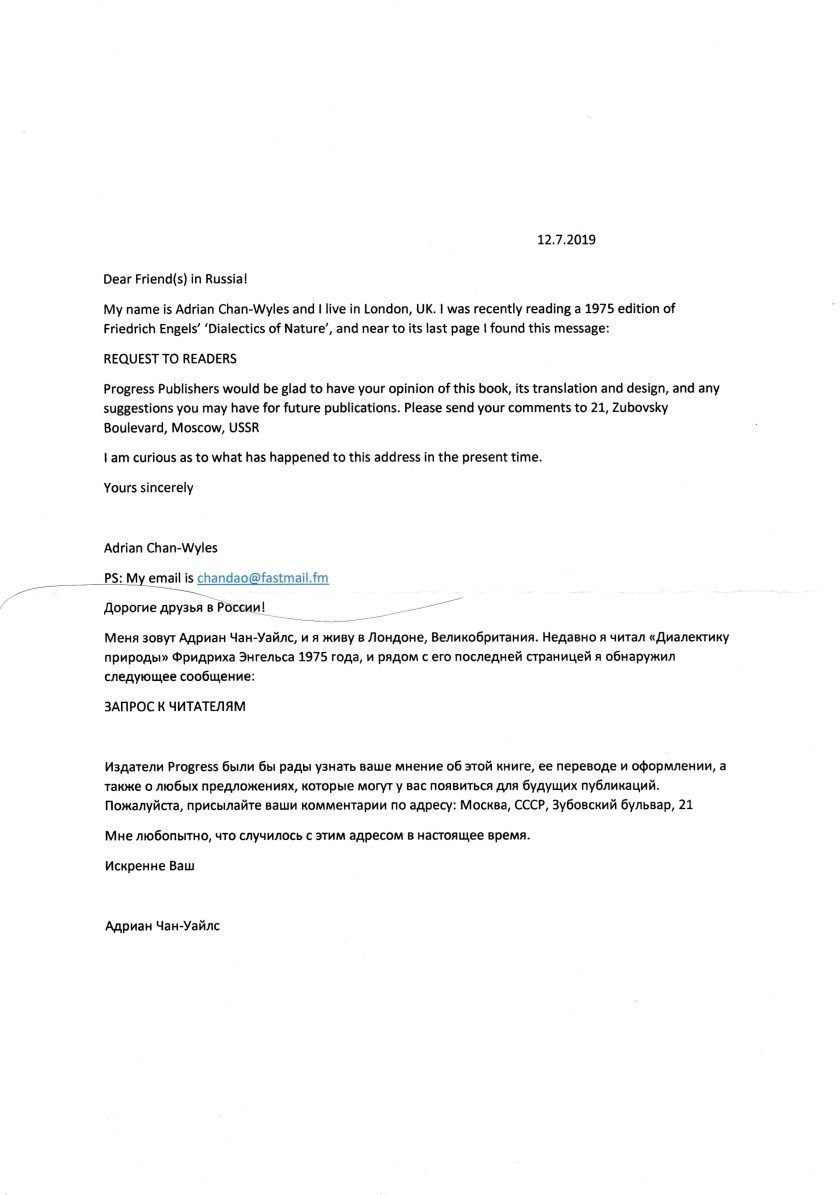 I was hoping that a kind of ‘time-travel’ scenario would develop when I recently sent this letter to modern (capitalist) Russia, and that I would receive a response from the Soviet Union! Alas, it was not to be. It appears that the modern Russian Post Office intercepted my letter without delivering it to the intended address. It was opened and my return address acquired. I did not even receive a response from the current owner of the propery, or an explanation of what had happened to this office of ‘Progress Books’. Although I am not sure, it seems that modern Russia is set on denying its Socialist past and carrying-on along its path of its capitalist counter-Revolution. What a sad loss to the world the collapse of the Soviet Union has been!