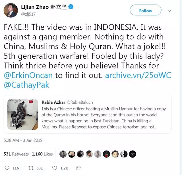The above rumor was posted on December 31st, 2018 – apparently by a woman named Rabia Azhar – on Twitter which is a bourgeois overseas social media platform. Roughly speaking, this rumour stated that a Muslim in Xinjiang, China (original: East Turkestan) was ‘beaten hard by police’ ‘Just because this Muslim is’ copying the Qur’an ‘and asking people to repost her post to’ expose ‘China’s terrorist actions against Muslims.’ This is the video under discussion, with its real identity explained by Chinese diplomat Lijian Zhao: