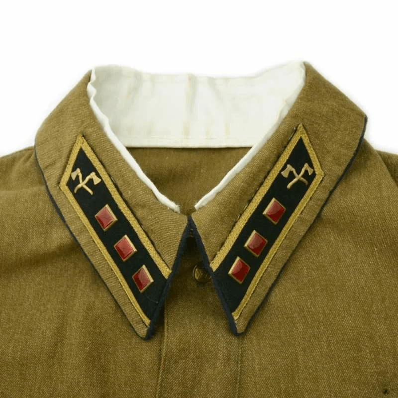 In addition to the collar badges, the Command Staff wore red chevrons as rank on both sleeves above the cuff of an overcoat and on a cuff of a tunic. Chevrons were the same for all branches of the military. Commissars and Political Pnstructors wore such insigna on both sleeves above the cuff of an overcoat and cuffs of a tunic; they wore red stars cut from cloth, edged with red thread and with a hammer and sickle embroidered in the center of the star. The rest of the Commanding Staff on the sleeves did not have any chevrons or other signs. In addition, the emblems of the relevant services were worn on the collars..