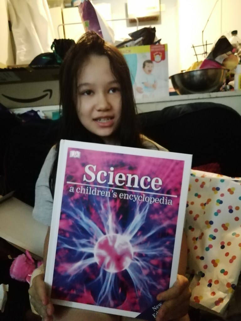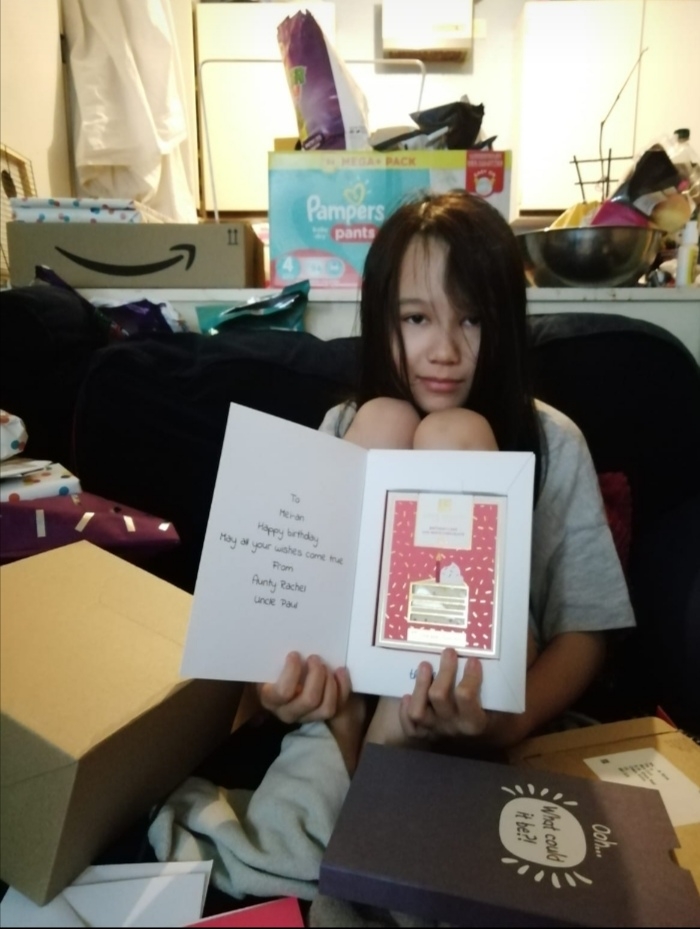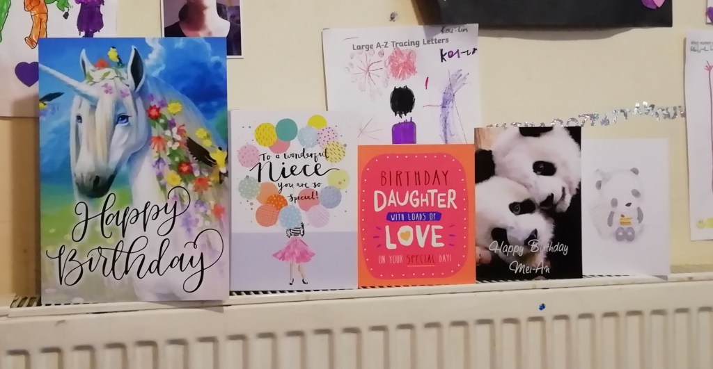 – a balloon and lots of presents – including books on science, advance ipad art creation, headphones (with mic), personalised jewellery, a stylus and an assortment of large soft-toys! We have just lit the nine candles on her birthday cake and sang ‘Happy Birthday’ to her!