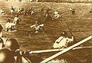 The Japanese fired heavy artillery onto the ships approaching the shore – followed by their targeting of the landing craft echelons – inflicting significant losses of ships and men. The following boats were destroyed or suffered significant losses of personnel – 4-5 (DS-1, DS-5, DS-9, DS-43, DS-47) to 7 landing craft (DS-1, DS -3, DS-5, DS-8, DS-9, DS-43, DS-47), 1 border boat PK-8 (5 crew members with the boat Commander killed and 6 wounded) and 2 small boats, damaged 7-8 landing craft (DS-2, DS-4, DS-7, DS-8, DS-10, DS-48, DS-49, DS-50) and 1 transport. There were significant losses in their crews. Japanese aviation also attacked the ships, but without much success (the patrol ship Kirov received minor damage from close explosions of bombs and 2 wounded crew members), while 2 aircraft were shot down by anti-aircraft fire. Nevertheless, under Japanese fire, Soviet ships continued to land personnel of the main landing force. The impossibility of reinforcing the landing with artillery had an extremely unfavourable effect on the course of the battle – there were no floating craft for unloading guns from ships and delivering them to the shore. The Japanese command also (on this and the next day) hastily transferred reinforcements from Paramushir to Shumshu.