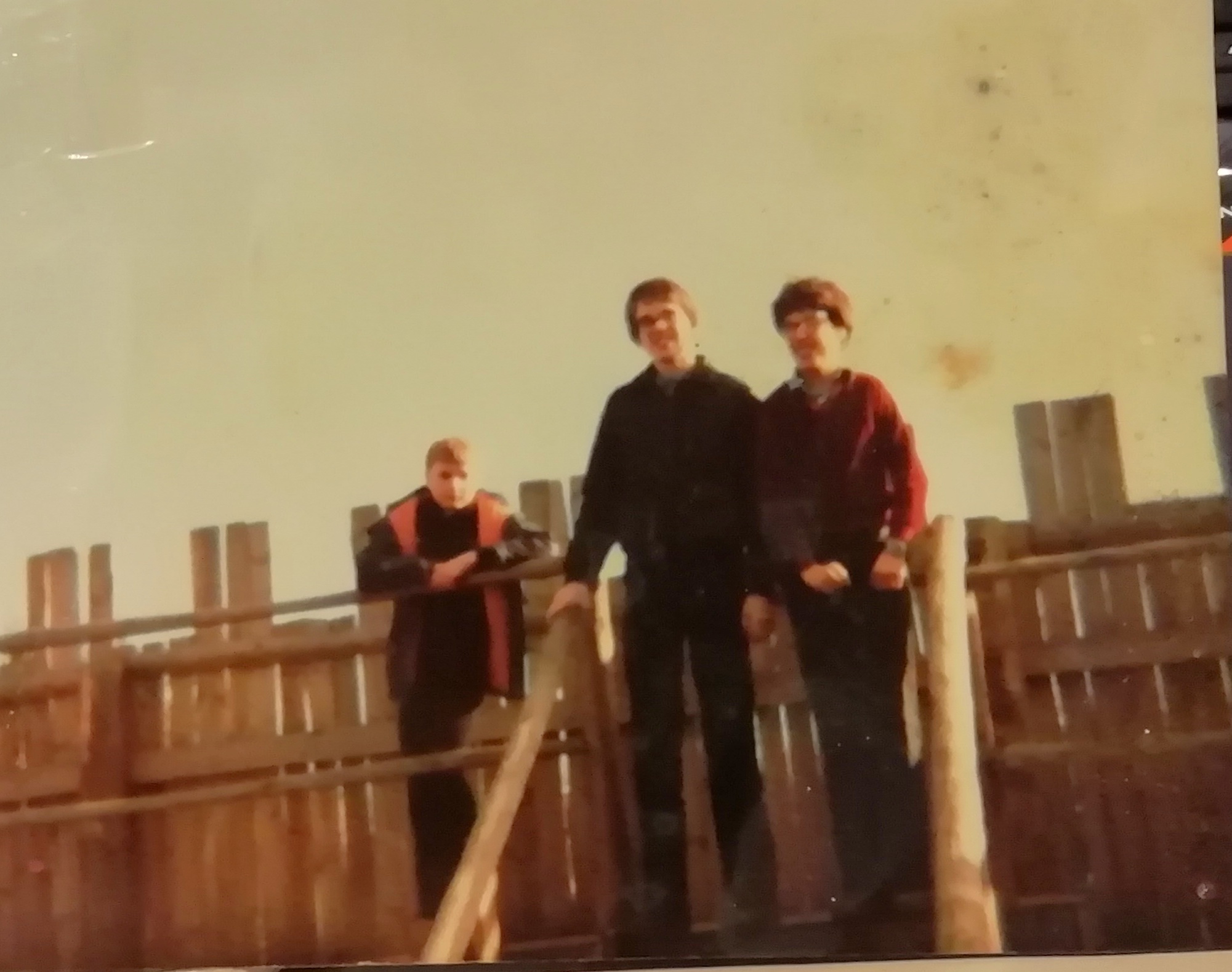This was a large wooden Fort comprised of thin but sturdy logs (as evident in the picture). It was probably built on a design covering around twenty-square yards (approximately). It was only accessible at one side, which possessed a large front-entrance that did not have a door that could be either ‘closed’ (thus trapping the occupants) or ‘weaponised’ (as a ‘siege’ device) by ‘out of control’ young children playing their various enactments of war games! The walls were about 15 feet high – but this was probably around 5 feet higher over the raised door section. Like a real fort, steps could be climbed to access a rampart that traversed the entirety of the structure! Those of a brave disposition would climb over the edge of the back wall (situated opposite a farmer’s field) and ‘drop’ down to the ground and attempt a ‘parachute roll’ (this often ended with those falling landing squarely upon their feet [spread shoulder-width apart] only to experience their rapidly bending knees hitting them squarely in the mouth!) – usually in an attempt to escape the scrutiny of any (feral) duty staff members roaming the battle fronts! Groups of children bound together by age and teaching class – would take it in-turns to a) take control of the fort, and b) defend it from the attack of competing groups of children! Weapons involved mostly ‘pushing’ or, in the case of the grass being freshly cut – handfuls of carefully aimed hay! If the defending group could be lured into the nearby shrubbery (to the left of the fort when looking out the door), then the small incinerator could be used as a diversion and a means to ‘double-back’! If suffering a major defeat, a disgruntled group could find itself pushed all the back past the sandpit, the running track and the football field, and find themselves in the gardening area – confronted by two bemused resident donkeys who would continue to slowly chew a mouthful of grass! Geoffrey Mann (left) is around 12 or 13-years of age, whilst Laurence Orrell (Centre) is around 15-years-old, and Matthew Leonard is around 14-years-old. Taken c. 1982 – with Laurence Orrell being in Mr Packham’s Class.