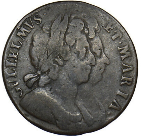 King William III reigned between 1689-1702, whilst Queen Mary II reign from 1689-1694. This means that Queen Mary died during the year of the minting of this coin (1694). The dimensions of this ‘William and Mary’ Half-Penny are as follows: 1) Diameter = 29 millimetres, 2) Weight = 11.100 grammes, and 3) Thickness = 2 millimetres. This coin design may well have contained a ‘toothed’ outer ring. This type of coin was issued by the ‘House of Stuart’ (through London’s Royal Mint) between 1688-1694.