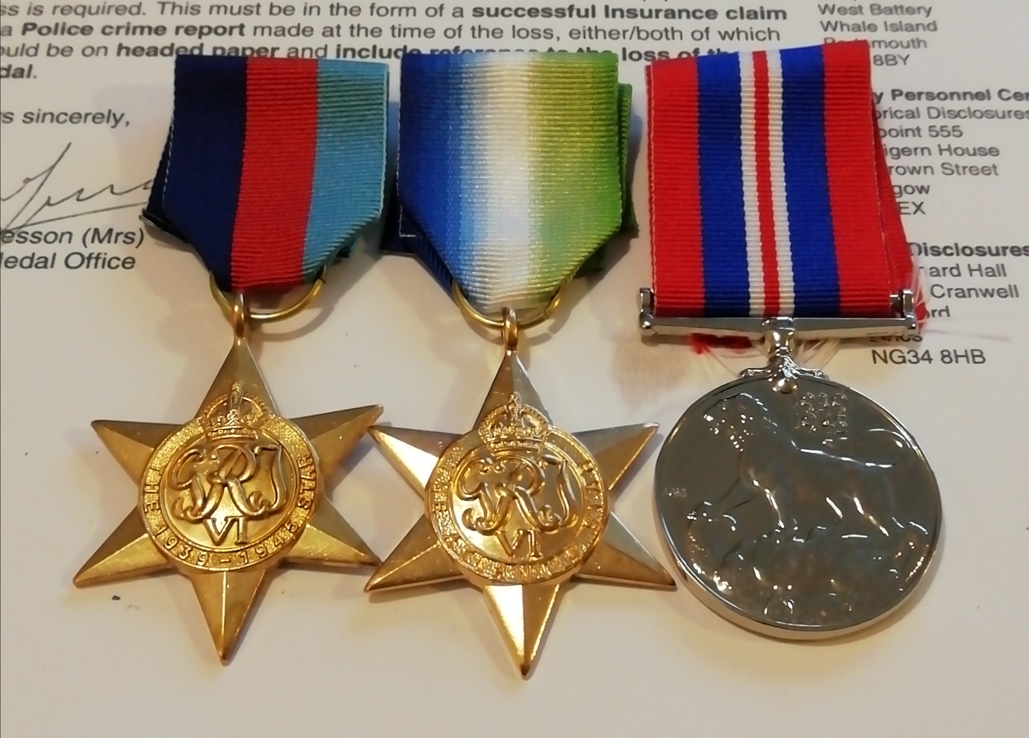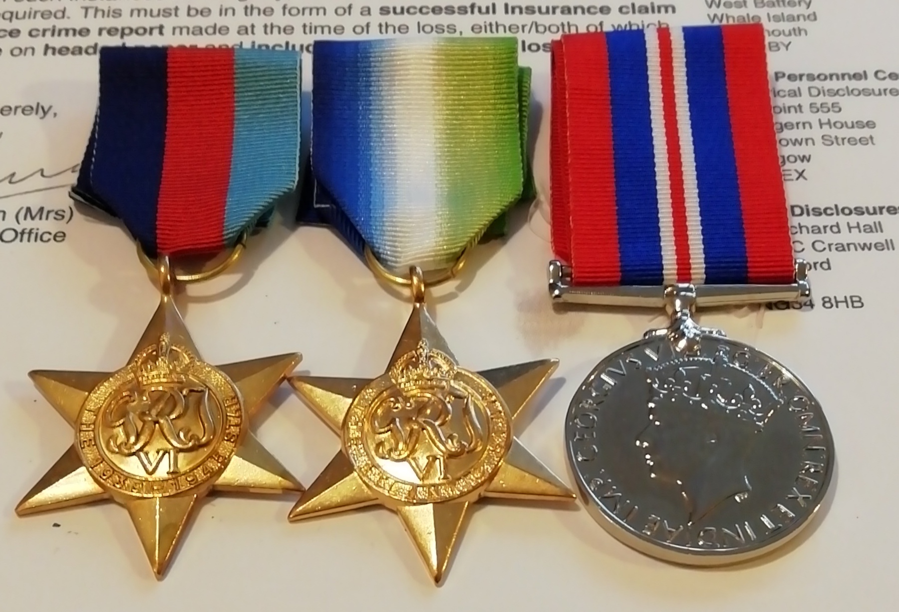 The 1939-1945 Star Medal, awarded to British Forces serving overseas during WWII. The 1939-45 Star Medal was introduced to reward the service of forces who served at least 180 days operational service overseas during WWII. Specifically, the 180 days must have been spent between the dates of 3rd September, 1939, and 8th May, 1945 (2nd September if spent in Far East). There are also some cases of special circumstances, where the medal was awarded for a single day’s service. The medal features the Royal cypher “GRI VI” on the front, supported by the text “THE 1939-1945 STAR” below, and the crown above. The ribbon displays equal stripes of red, light and dark blue, to represent the different arms of the armed forces.