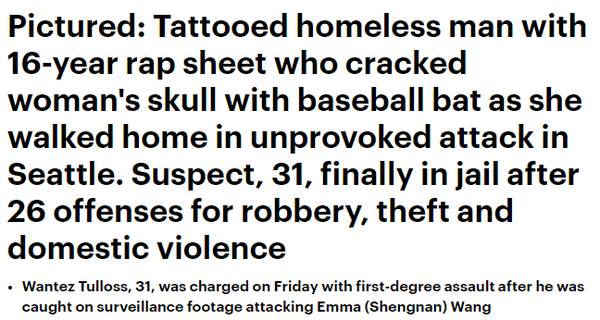 Wang Shengnan is from China where her parents still live. Obviously, her parents were devastated when they were told the news. After the incident, bystanders stepped forward to help Wang Shengnan and quickly called 911. Subsequently, Wang Shengnan was sent to Harborview Medical Center for treatment. Wang Shengnan suffered a fractured skull and possibly a concussion, requiring surgery. Tullos, 31, is a homeless man who has been arrested 11 times since 2006, is wanted by Washington police for third-degree theft. Touros was arrested for burglary in 2006; first degree robbery in 2009; theft in 2011; domestic violence, reckless driving, theft, battery in 2013; domestic violence violation in 2015 Arrested on restraining order; again in 2016 for violating domestic violence restraining order; third in 2017 for violating domestic violence restraining order; also convicted of domestic violence and child abuse misdemeanour in Tennessee, but unclear The specific time.’