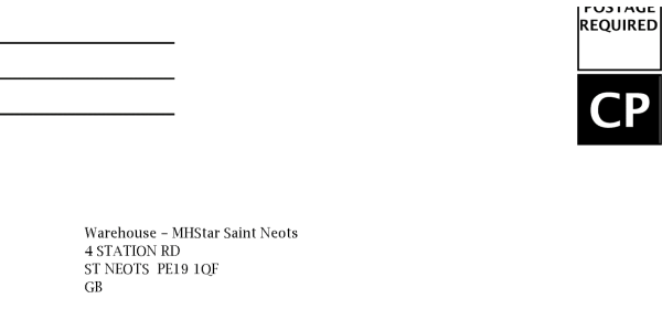 Warehouse – MHStar Saint Neots4 STATION RDST NEOTS, CambridgeshirePE19 1QFPhone: 08002404050 Bear in mind that ‘Amazon’ are preventing ‘poor’ or ‘bad’ reviews from being published