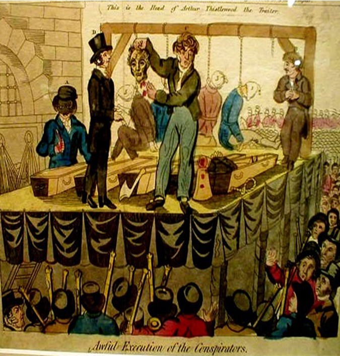 Thirteen of the main conspirators were charged with treason, and following a ‘show-trial’ by the Bourgeois State – five were sentenced to ‘Transportation’ to Australia – whilst five others were sentenced to be ‘Hanged’ and then ‘beheaded’ so as to set an example to the working-class of what will happen if any decide to rebel against the bourgeois control of society. This is a clear use of ‘terrorism’ by the bourgeoisie in an attempt to keep it corrupt control of society! Arthur Thistlewood and James Ings were two of the main ringleaders and as their executions were held in public outside Newgate Gaol – they put on a good and brave show – nonchalantly sucking on oranges as they were brought to the gallows with the other three condemned (including William Davidson)! Out of the five – James Brunt James Ings refused to ‘die’ quickly and so the executioners had to resort to ‘pulling their legs’ to speed-up the process! The next stage in this bizarre and macabre demonstration of bourgeois power was the spectacle of a ‘hooded’ surgeon on the scaffold tasked with ‘surgically’ removing the heads of all five now ‘dead’ men with a scalpel! This individual then held up each head and announced the name of its own declaring ‘This is the Head of a Traitor!’ Before throwing the head into a pile of nearby sawdust! This is what the bourgeois does to the working-class when it dares to seize control of the means of production and change society for the better!