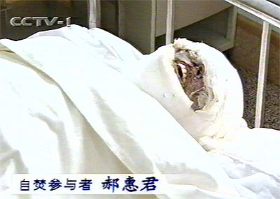 四名烧伤人员由于烧伤情况十分严重,现在还未完全脱离危险,医院正在对他们进行抢救治疗,加紧创面处理和营养支持,以防止各种并发症的发生。图为躺在病床上的自焚者之一郝惠君。(图片来自CCTV新闻联播)