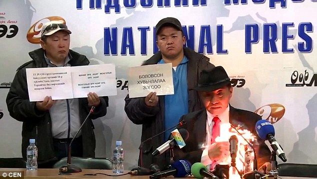 ‘The British “Daily Mail” reported on November 16th (local time) that the Chairman of a Mongolian trade union set himself on fire at a press conference to protest the sales restrictions aimed at the coal mining industry by the Mongolian government. The ‘unnamed’ man first sprinkled alcohol over his body, and then set himself on fire in front of many reporters. After removing the still burning clothes from his body, other members of the trade union present – hurriedly stepped forward to save him. This ‘unnamed’ union official held a press conference within which he raised with the media the dire problems that Mongolian miners are facing. Amid the chaos, someone snatched the microphone while others were filming the stunning scene. The man reportedly suffered severe burns and was rushed to hospital. Currently, the man is in critical condition.
