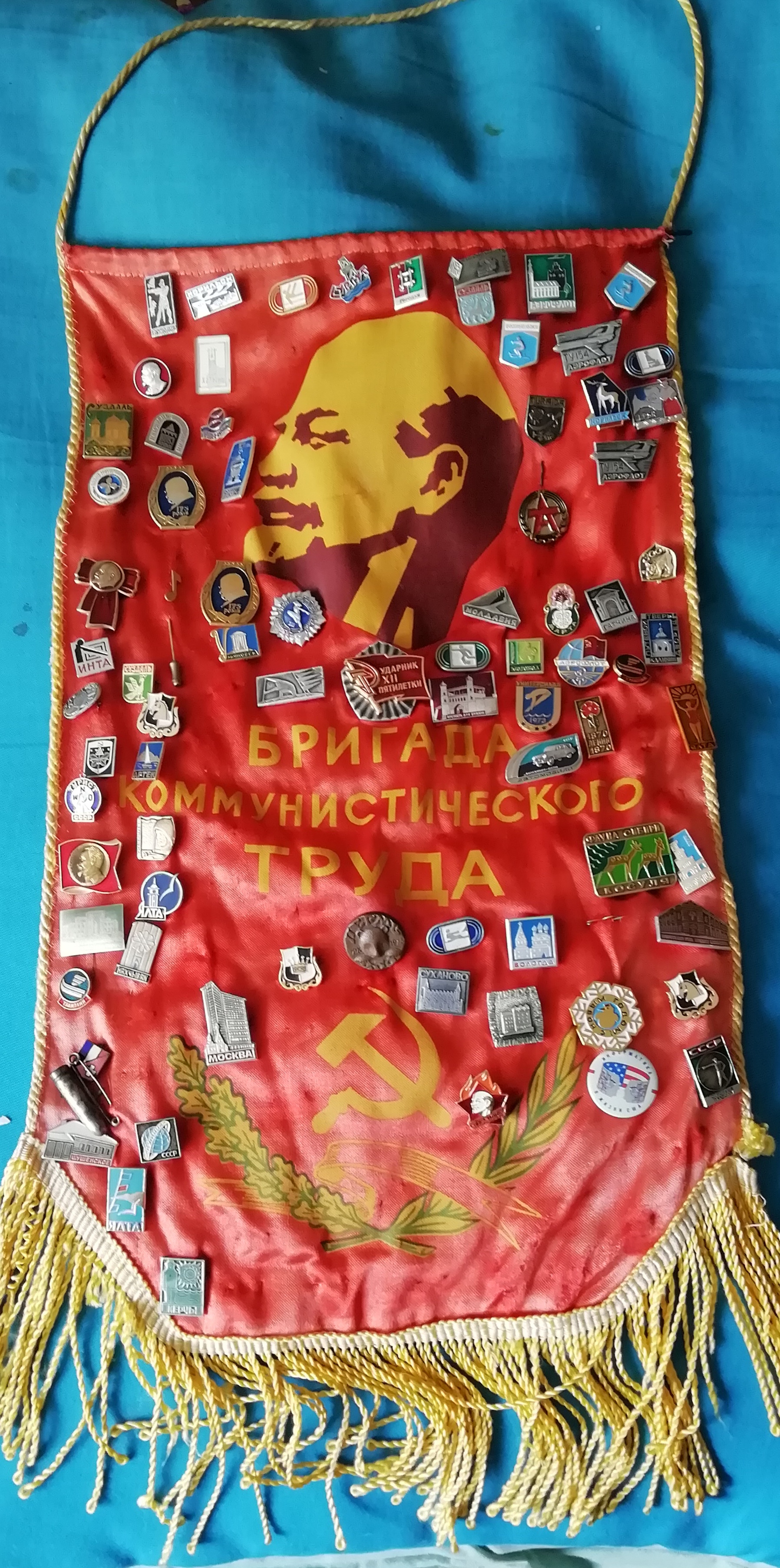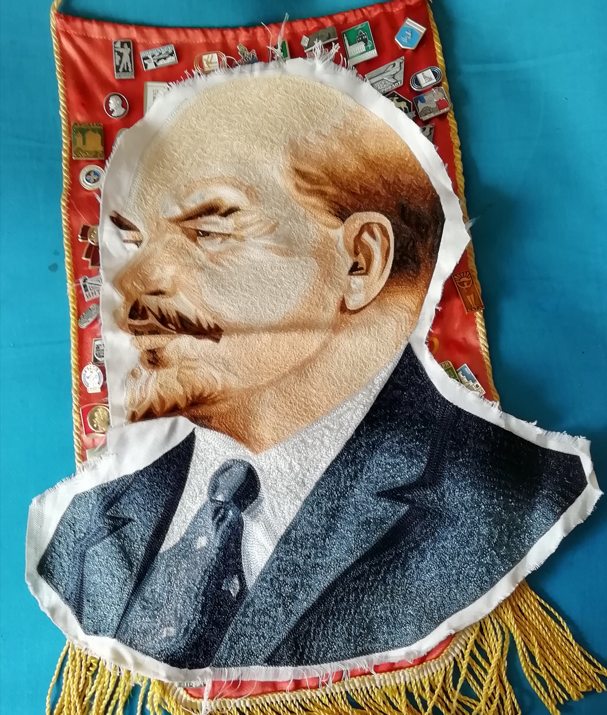 We were sent two Soviet-era Artefacts (pictured above) – one cut by a Neo-Nazi thug from a hanging banner in a Kyiv Museum – and the second hidden for decades in an attic in Kherson! These important historical artefacts were posted to use for us to keep safely so that the ‘Maidan’ Neo-Nazi thugs could not get their hands upon them! In the case of the second object, the owner’s grandfather (a Red Army Veteran) had look after it for decades whilst younger relations had collected and pinned badges to it! Oneday, we intend to catalogue all the badges!
