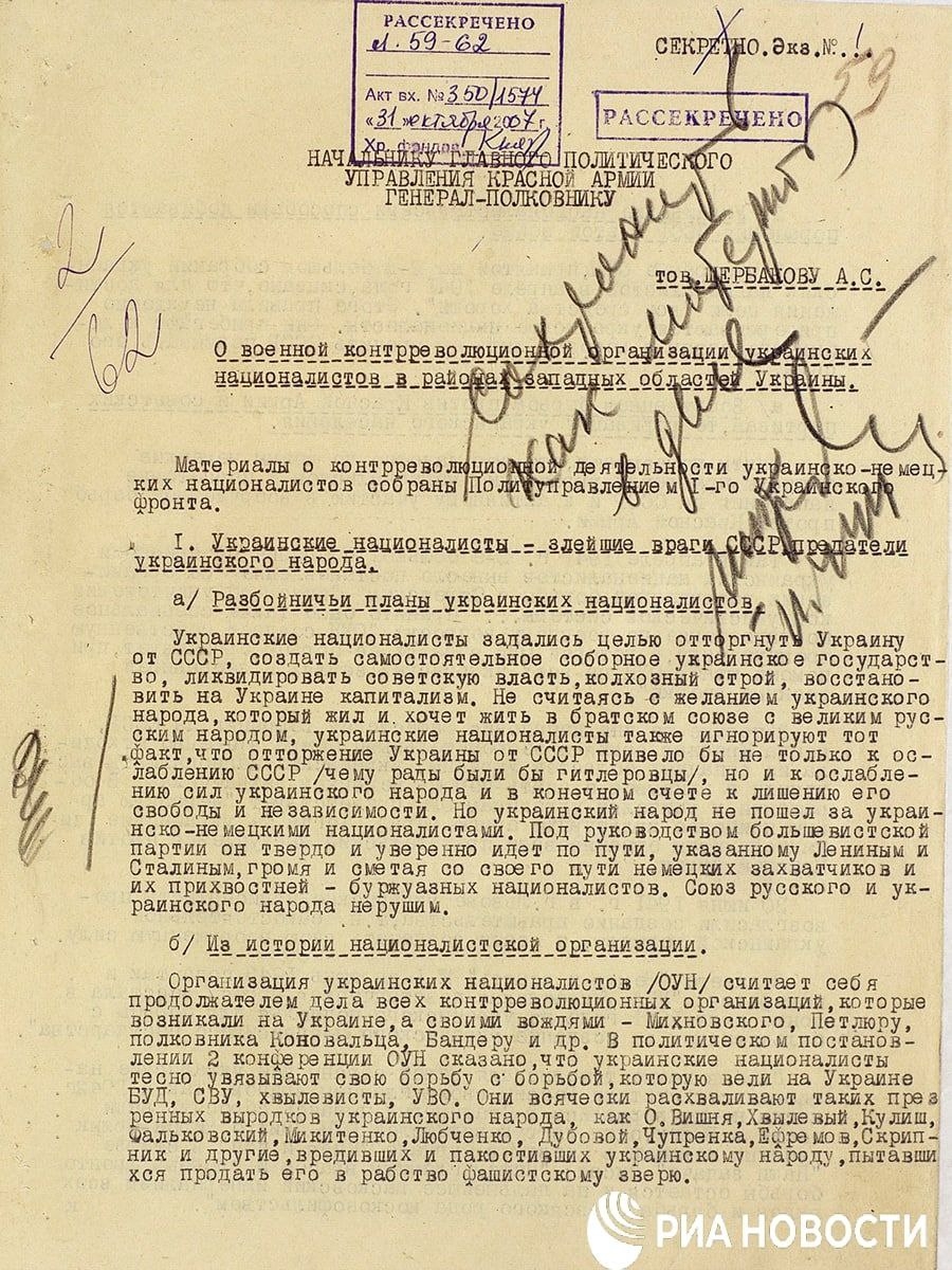 Различные донесения, информационные записки, в том числе ряд документов, доказывают тесное сотрудничество украинских националистов с немецко-фашистскими оккупантами.