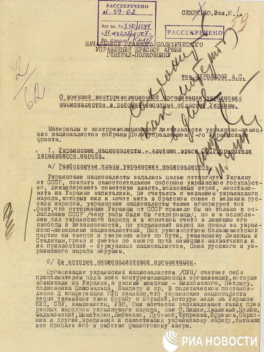 The Ministry of Defense of the Russian Federation has published new evidence of the atrocities of Ukrainian nationalists during the Great Patriotic War. Various reports, information notes, including a number of documents, prove the close cooperation of Ukrainian nationalists with the Nazi occupiers. LEVITAN