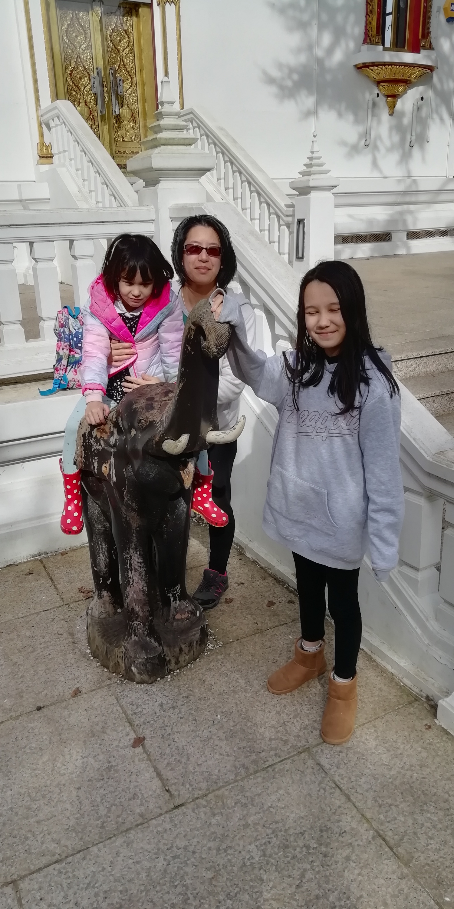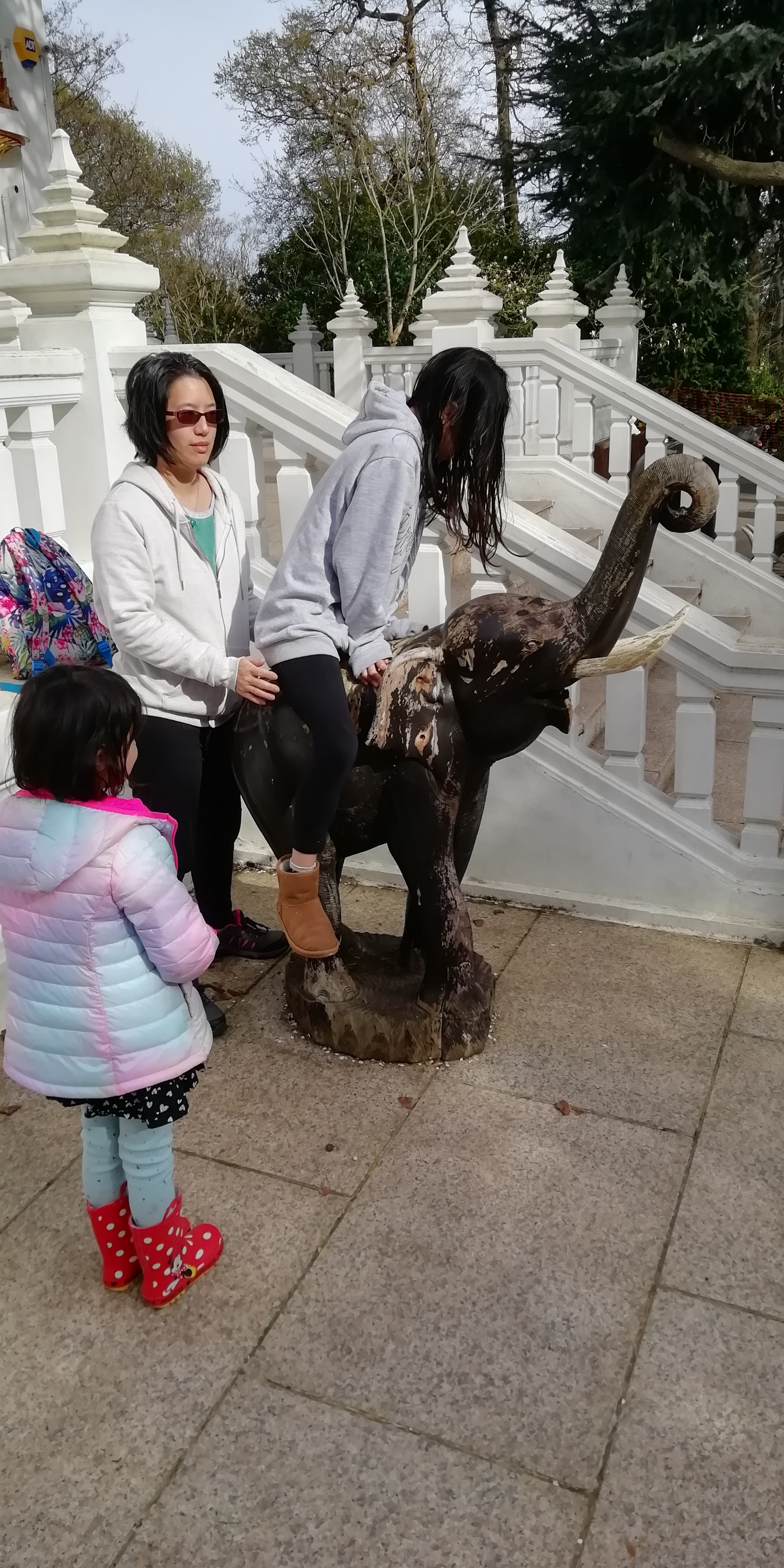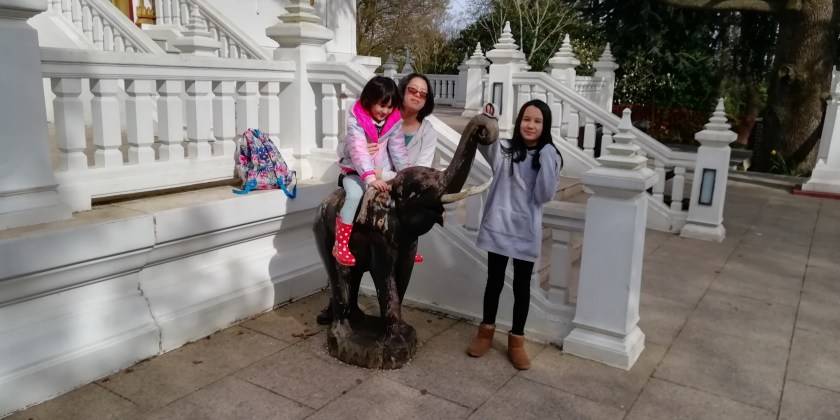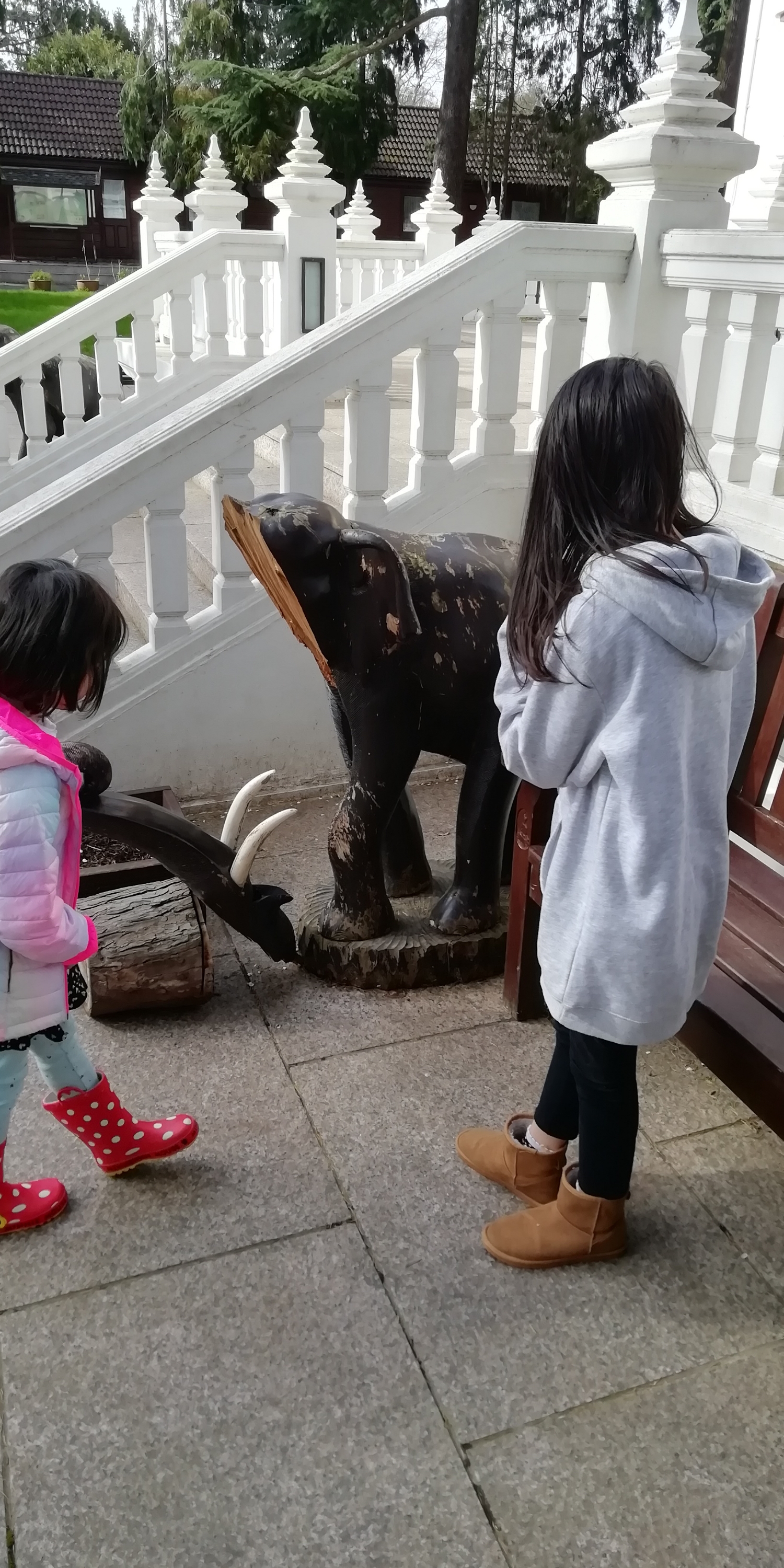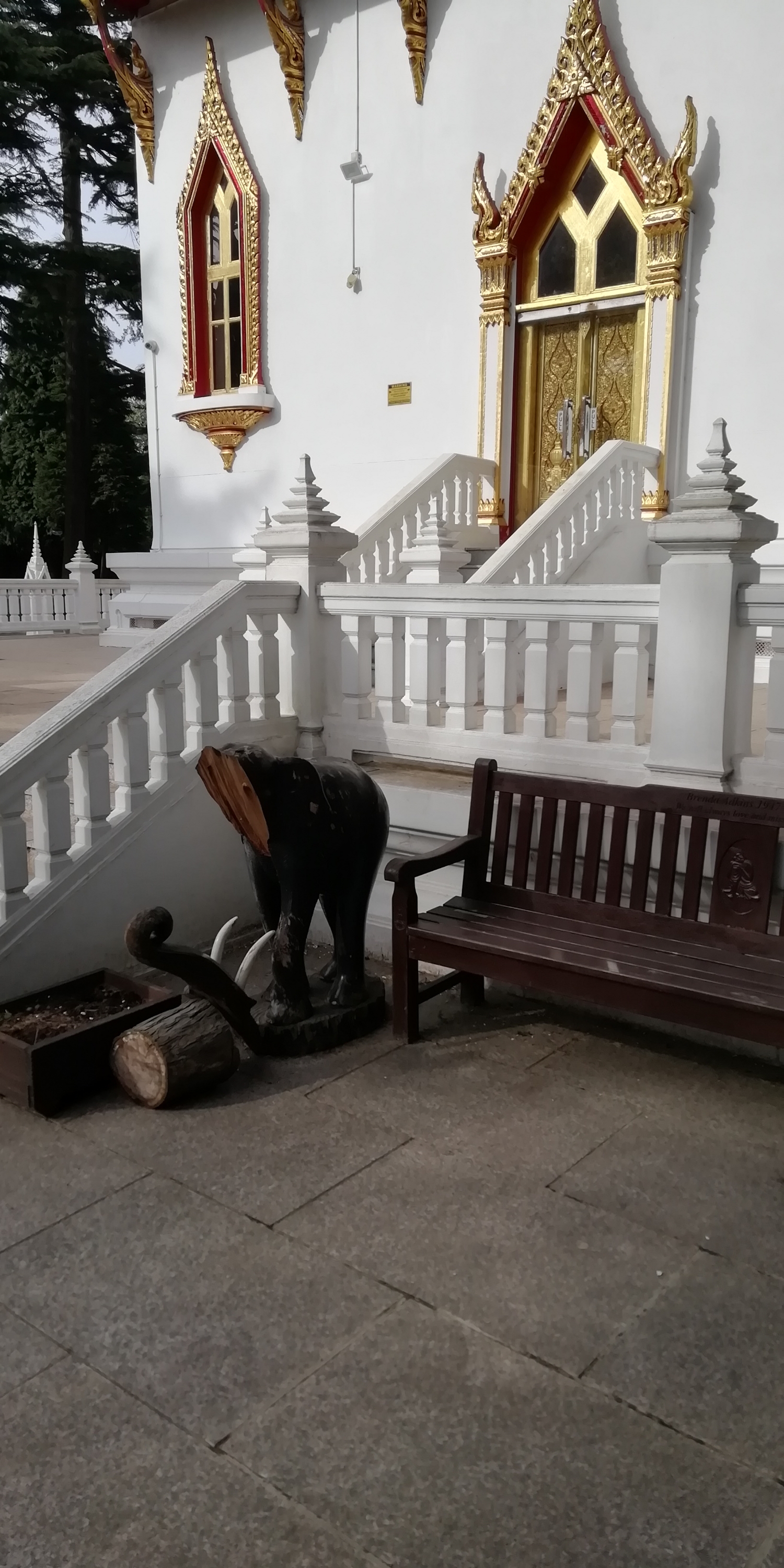 There are two stone elephants situated at the base of a set of stairs outside the Main Temple building at the Buddhapadipa Temple! The left-hand elephant is in one piece – but the elephant to the right has suffered damage in that the trunk and face has split-away! If anyone can repair this, please contact the Temple. Upon reflection I suspect children climbing the elephants have not helped matters over the years… The left-hand elephant nobly sustained our two children!