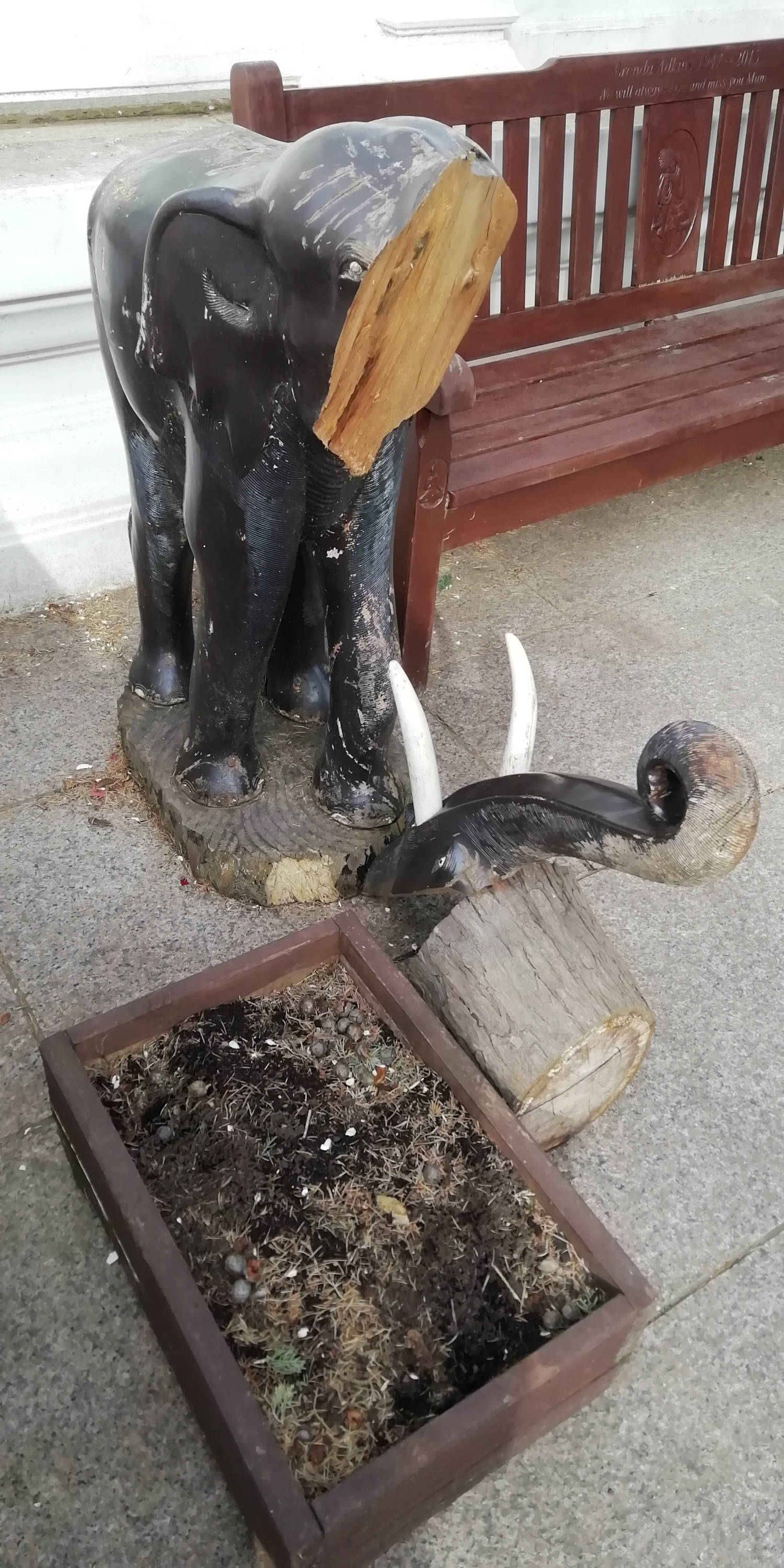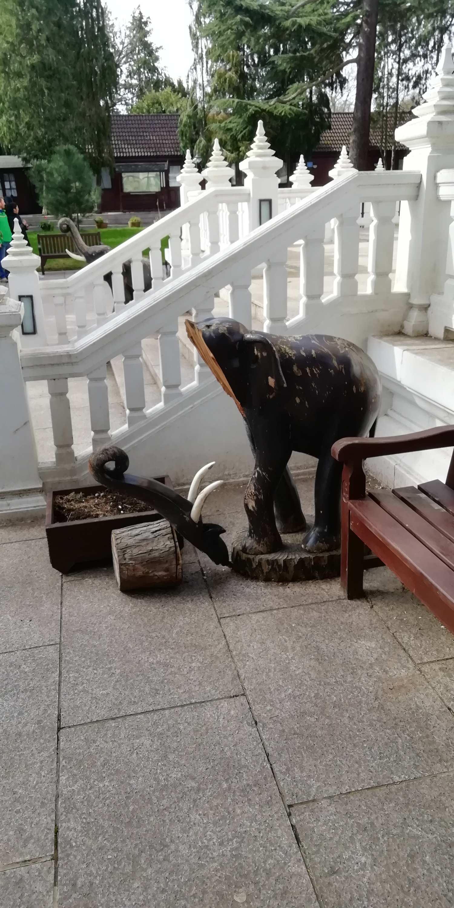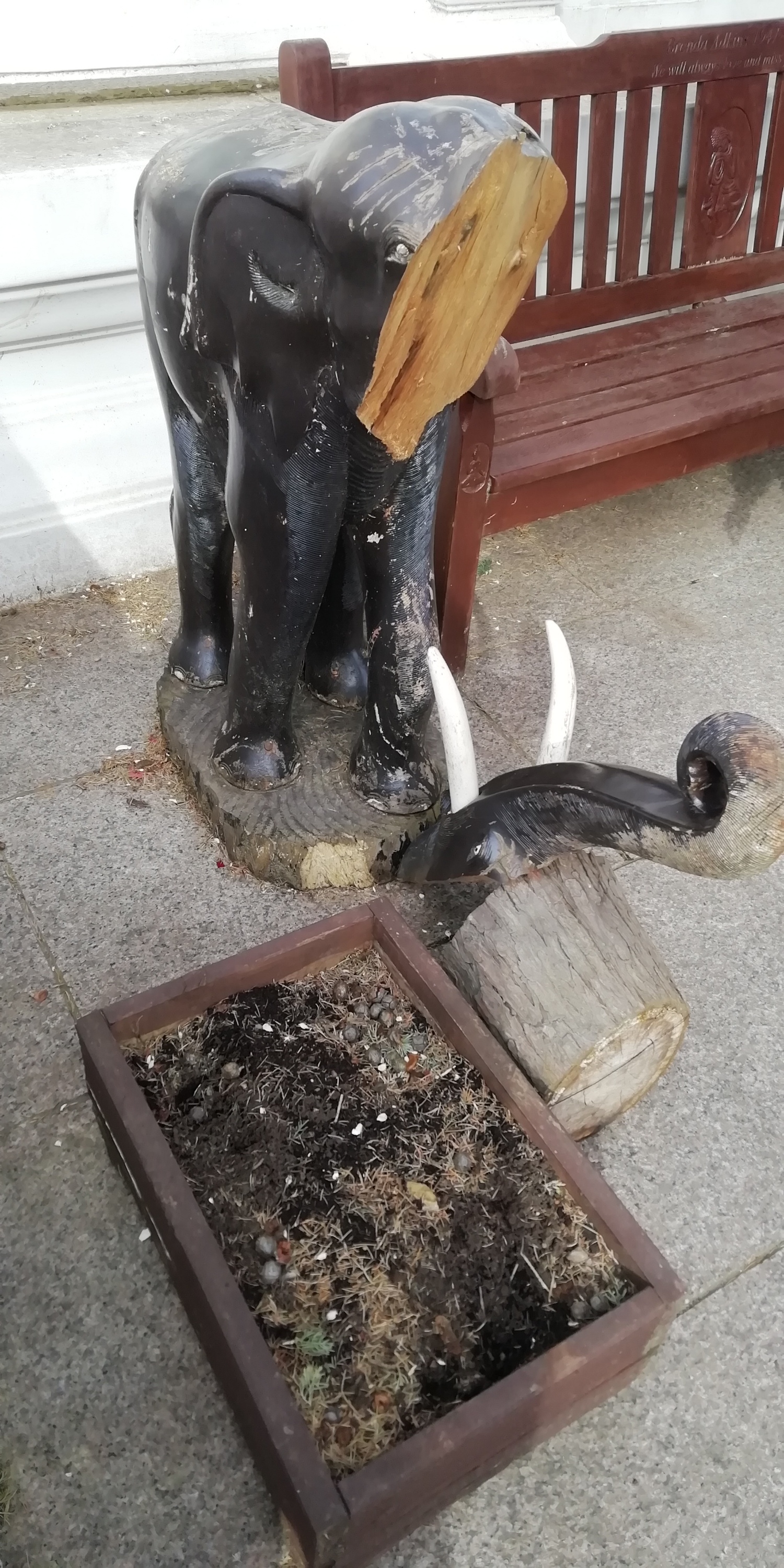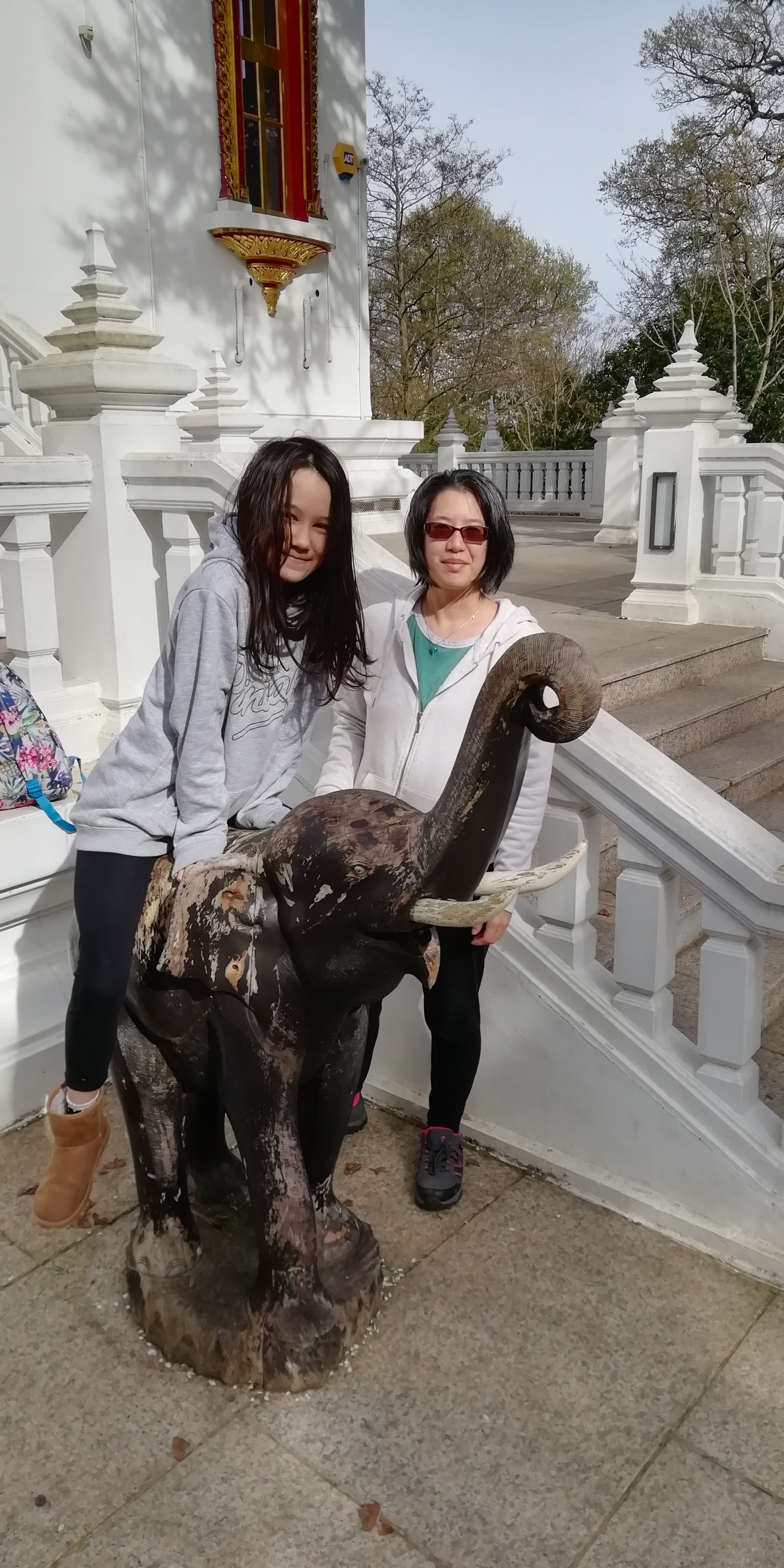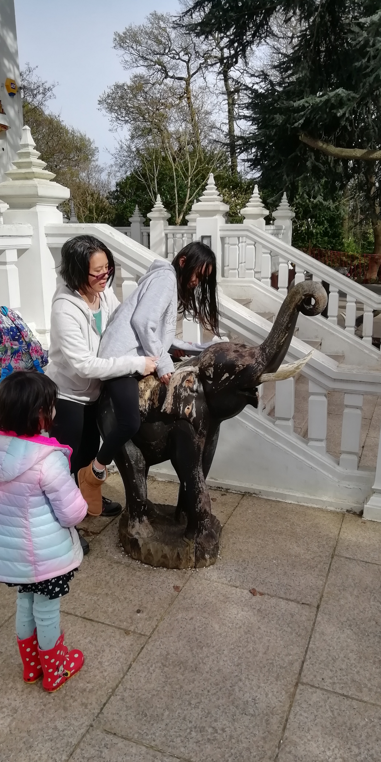 There are two stone elephants situated at the base of a set of stairs outside the Main Temple building at the Buddhapadipa Temple! The left-hand elephant is in one piece – but the elephant to the right has suffered damage in that the trunk and face has split-away! If anyone can repair this, please contact the Temple. Upon reflection I suspect children climbing the elephants have not helped matters over the years… The left-hand elephant nobly sustained our two children!