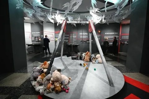 A separate section titled “Nazism Today” shows dozens of examples (i.e., ‘evidence’) of the existence of pro-Nazi sentiment in Ukraine. Among these are books, uniforms, propaganda paraphernalia of Ukrainian nationalists, as well as items with Nazi symbols, etc. Material evidence is supplemented by photographs and memories of eyewitnesses of the crimes committed by supporters of this ideology against the civilian population of Ukraine. In the centre of the exposition is an installation dedicated to the dead children of Donbass.
