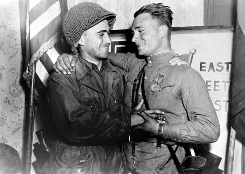 Happy Lieutenant W. Robertson and Lieutenant A. S. Silvashko against the backdrop of the inscription “East meets West”, symbolizing the historic meeting of the allies on the Elbe