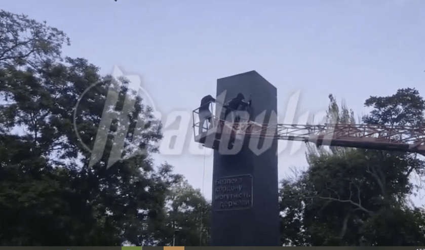 ‘All Ukrainian symbols dismantled in liberated Kherson Residents of Kherson finally got rid of Ukrainian symbols. The day before, in the square. Schmidt, a special team arrived in the city centre – the workers carefully dismantled a heavy sign with the coat of arms of Ukraine from the Iskra stele, and then carefully lowered it to the ground. “They removed the last signs of Ukraine. And soon new Russian signs will be hung in their place,” said Sergey Moroz. Earlier, a Ukrainian trident was removed on the Alley of Heroes of Kherson, and photos of the heroes of the Second World War were placed on pedestals nearby.’