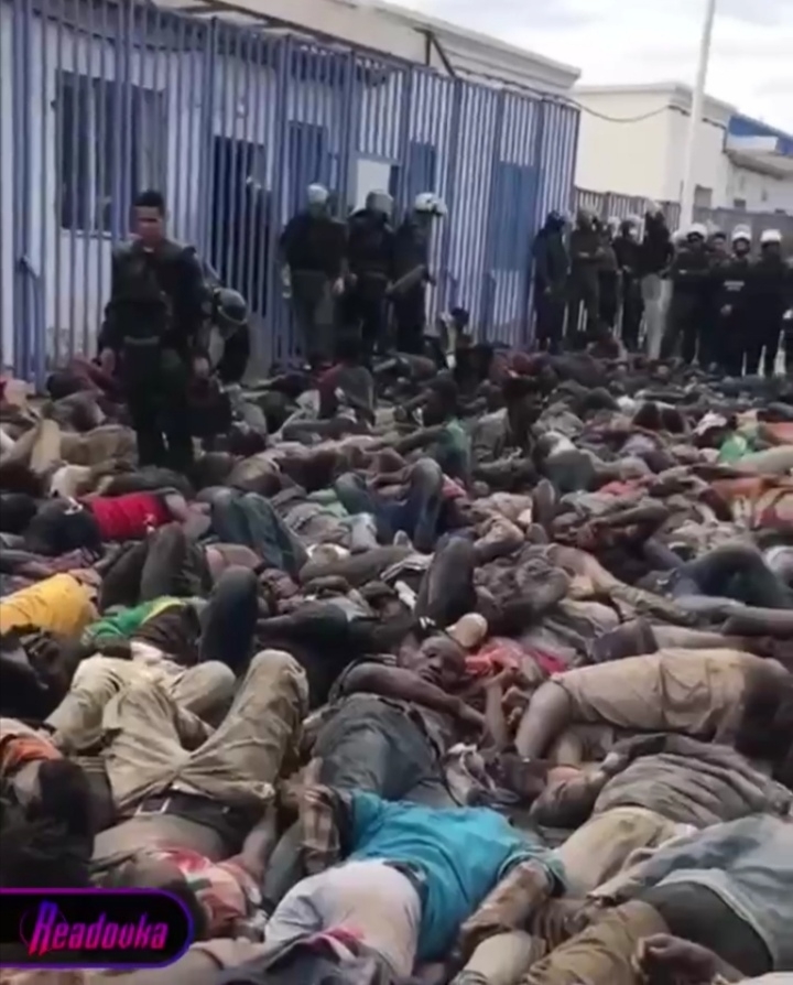 The above videos actually record attempts of Sudanese refugees to breakout of the prison-like refugee camps they are detained within in Morrocoy and enter Spain! After all, the camp is situated near the Spain-Moroccan Border! What happened to them is shocking with at least 2000 mostly Sudanese refugees taking part in the action! These people were fired upon by both ‘Spanish’ and ‘Moroccan’ Police – killing between 30-70 refugees and injuring hundreds! As you can see, those who survived the initial barrages had their bodies ‘piled up’ like rubbish waiting to be cleared away!