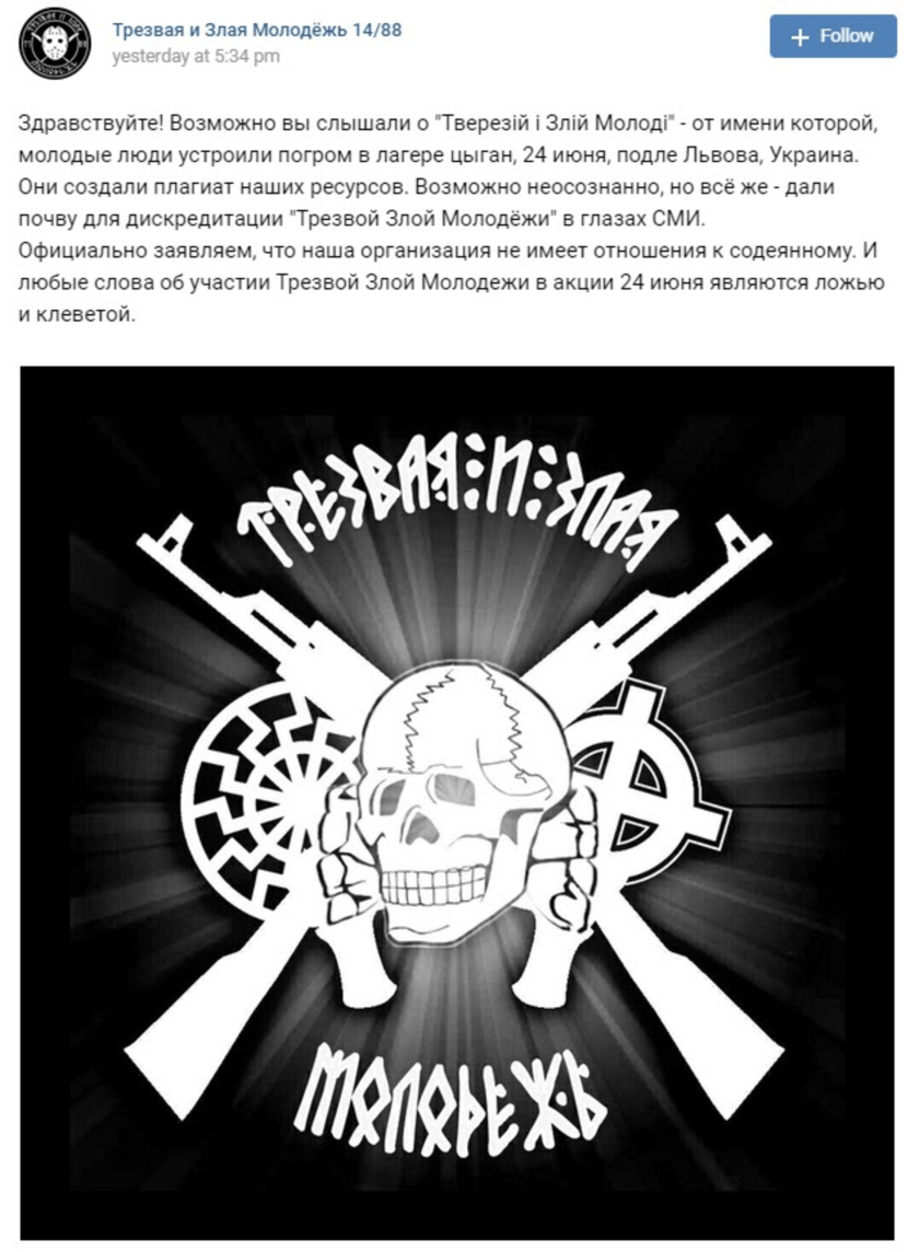 ‘The Ukrainian website Zaxid.net was the first to report that a police source linked the attackers to the Sober and Evil Youth Group. Subsequently, this was confirmed by other sources in the Ukrainian police and special services. There is no evidence of any connection between Popovich and any of the Roma camp attackers in Lviv (or with the attack itself). At the same time, the move he popularized is related to this attack.
