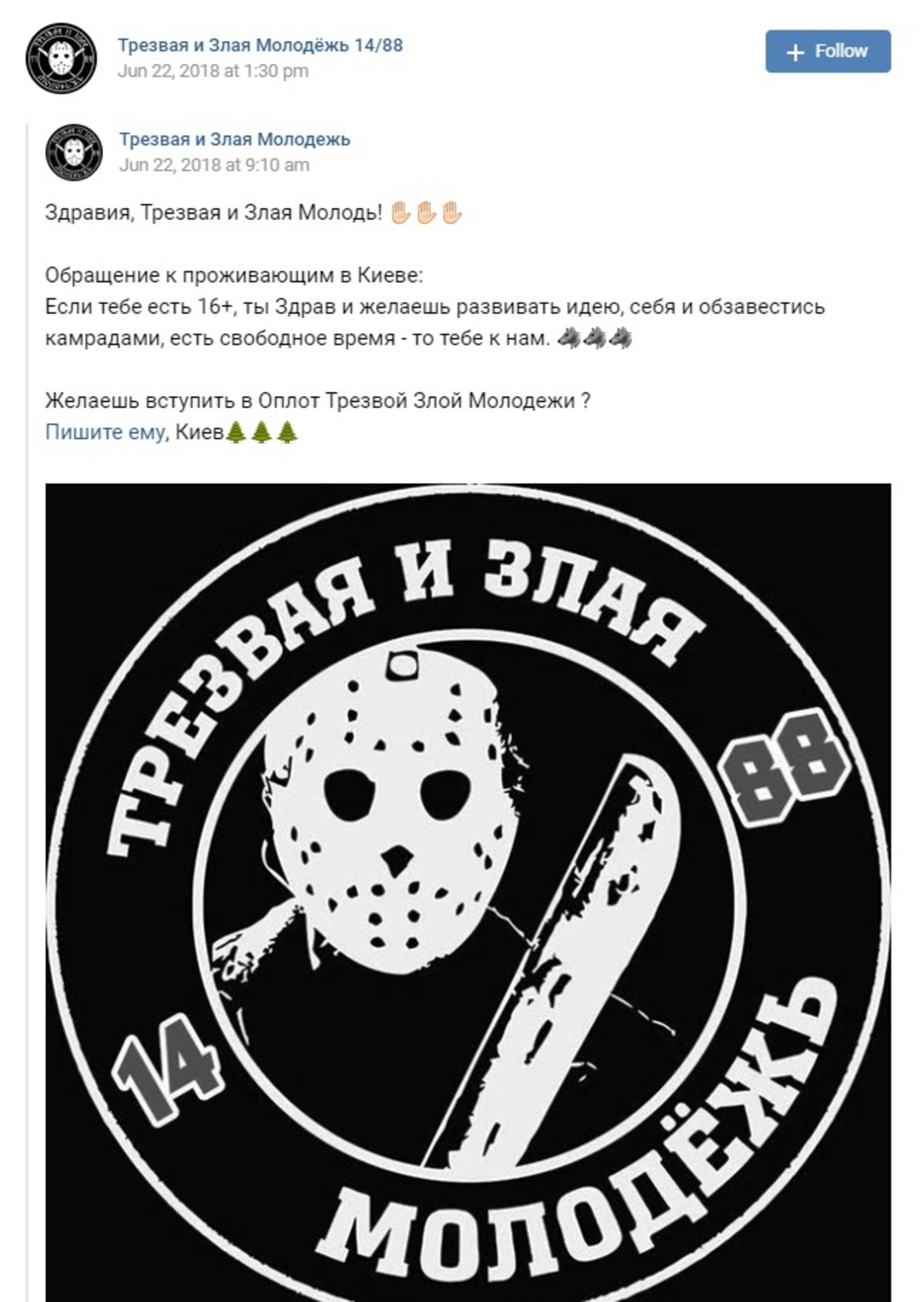 Gritsak said that “an organization with the same name was registered in Russia in 2014.” It is not known whether he meant that the organization was officially registered, or whether it simply appeared in Russia. If Hrytsak meant a large community on VKontakte, which was also registered in 2014, then he was mistaken, because Popovich lived and, apparently, lives in Ukraine. The Kremlin is known to finance and support various ultra-right and neo-Nazi groups in Europe and Russia, in particular because of the billionaire Konstantin Malofeev (suspected of financing the self-proclaimed “LPR” and “DPR”). However, there is no obvious connection between the Sober and Evil Youth and the Kremlin, except for the Pan-Slavist ideology that is characteristic of various far-right groups in the region.’