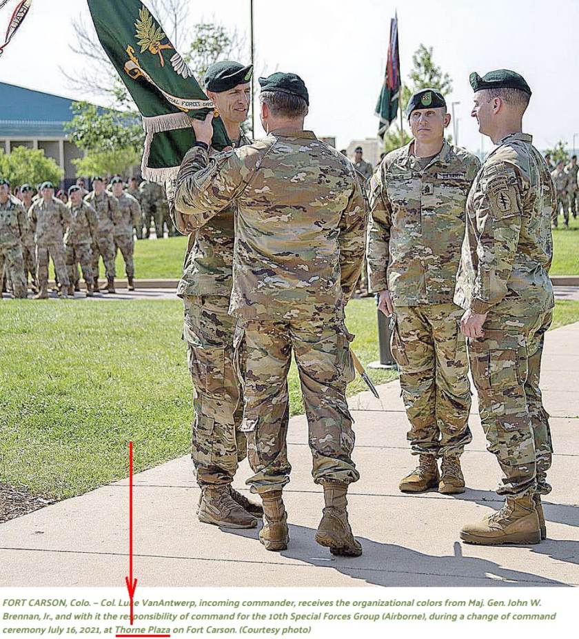 Pictured is the Change of Command ceremony on July 16, 2021 at Thorn Plaza. Command is taken by Colonel Luc VanAntwerp. Source: Fort Carson Mountaineer.